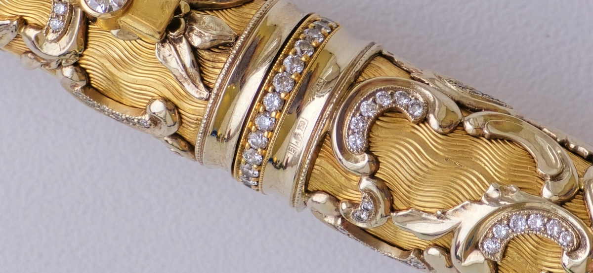 Секция тоже изготовлена из золота 750-й пробы. А вот клип — из золота пробы 585, но сделано это не для удешевления (с таким-то количеством камней, ага), а чтобы он был функциональным: 585-я более твёрдая и упругая. Вроде бы мелкий нюанс, а уже о многом говорит.