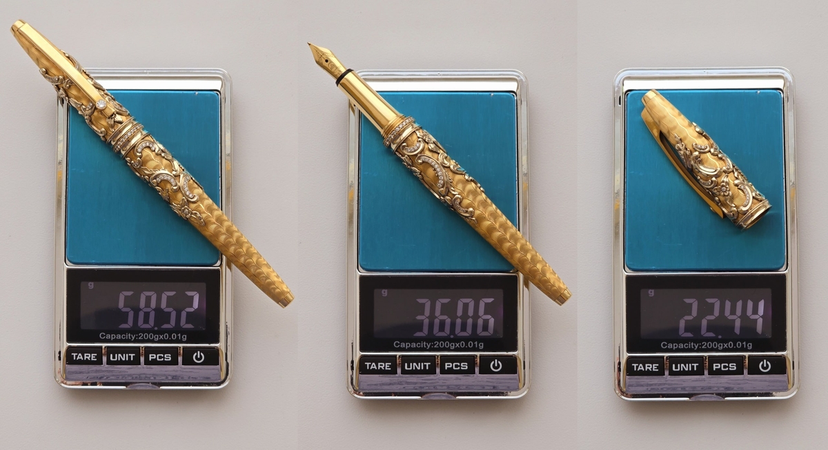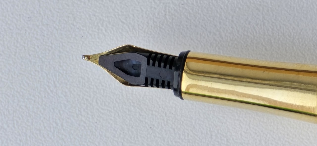 Несмотря на тонкую секцию и наличие ступеньки, эргономика очень хорошая, поскольку секция длинная и абсолютно нескользящая (в этом плане золото уступает в цепкости разве что серебру). В моделях, где корпус сливается с колпачком в единое целое, ступенька между корпусом и секцией неизбежна, однако здесь плавное расширение секции, гладкая резьба и отсутствие острых граней на кольце делают её практически незаметной во время эксплуатации.