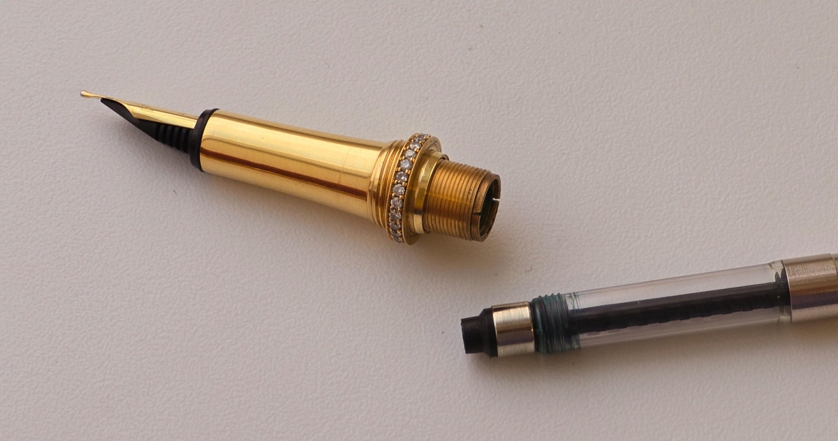 Ещё одна приятная мелочь: декоративное кольцо с бриллиантами — часть секции, а не корпуса, а значит, к нему можно прилагать значительное усилие как при закручивании, так и при откручивании секции. Иногда это очень важно — допустим, если резьба была залита чернилами или закисла. Да и просто так удобнее.