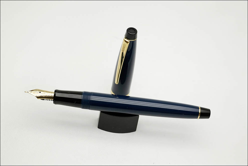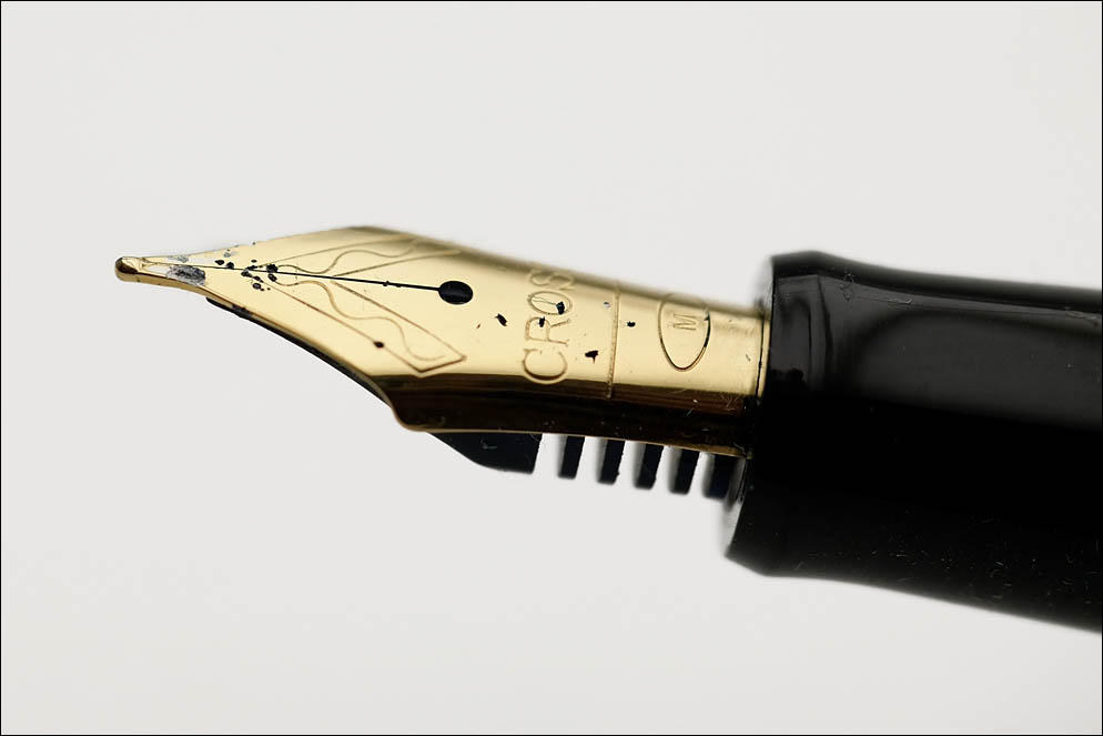Стальное, позолоченное, 5-го размера (5,5), производства компании Pilot, практически идентичное перу в модели Cross Townsend, только без ушек для позиционирования на фидере. Сам фидер тоже имеет другую форму — без эбонитового сердечника. В данном случае ручку оставили с очень агрессивными чернилами на долгий срок, поэтому коррозия нанесла непоправимый вред перу…