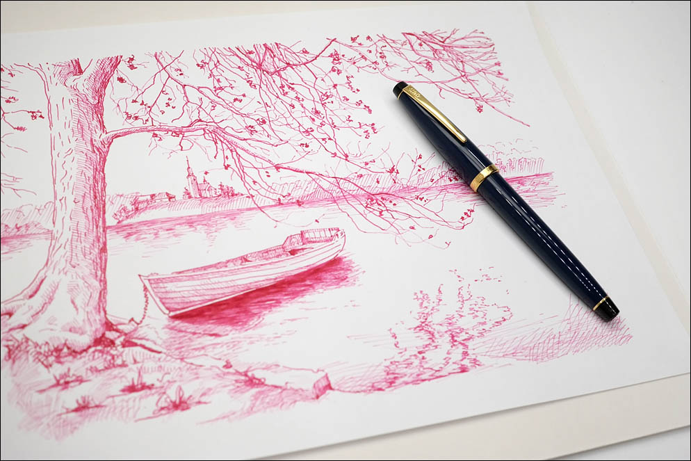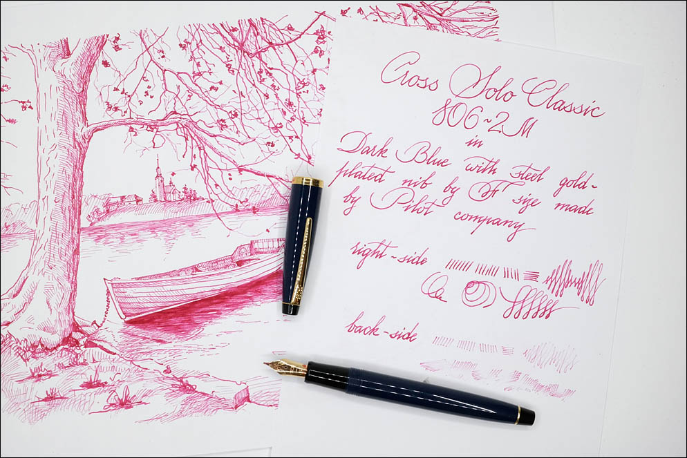 Ширина ординарной линии прямой стороной составляет 0,5 мм, что соответствует европейской размерности М, как и у Таунсендов, несмотря на японское происхождение. Нажим за счёт подачи может увеличить её до 0,7 мм. По ощущениям перо более жёсткое и не такое упругое, как на Таунсенде. Обратная сторона даёт прозрачную линию шириной 0,3 мм и с пропусками при быстром штрихе.