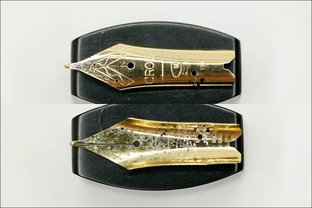 Во всех отзывах, что я находил в Интернете, пользователи отмечают невероятно гладкое перо производства Pilot, с чем полностью согласен. Не встречал случаев коррозии, похожих на этот, поэтому, если предположить, что сие — индивидуальное очень неудачное стечение обстоятельств, можно говорить о хорошем соотношении цены и качества для любителей гладкого письма без дополнительных требований.