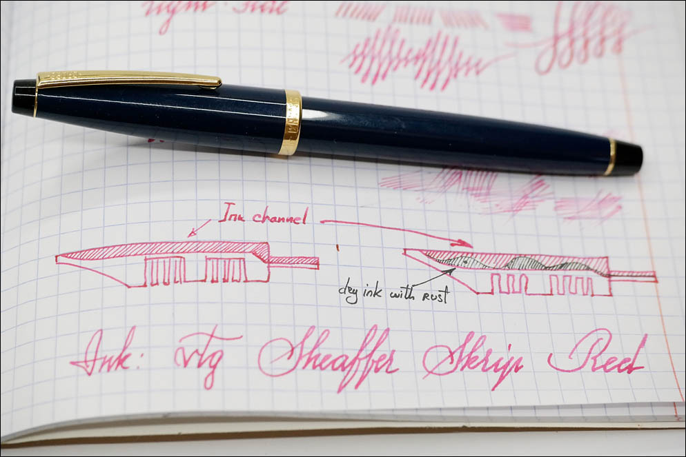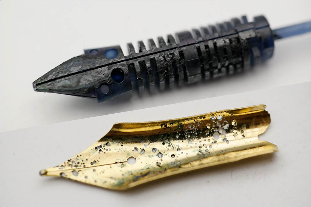 Более того, смесь ржавчины и засохших чернил наполовину забили чернильный канал и частично ламели фидера. На картинке ниже (справа) я постарался изобразить, как это выглядело. Чернильный канал пришлось прочищать механически. По всей видимости, это и было причиной частого прекращения подачи чернил к перу.