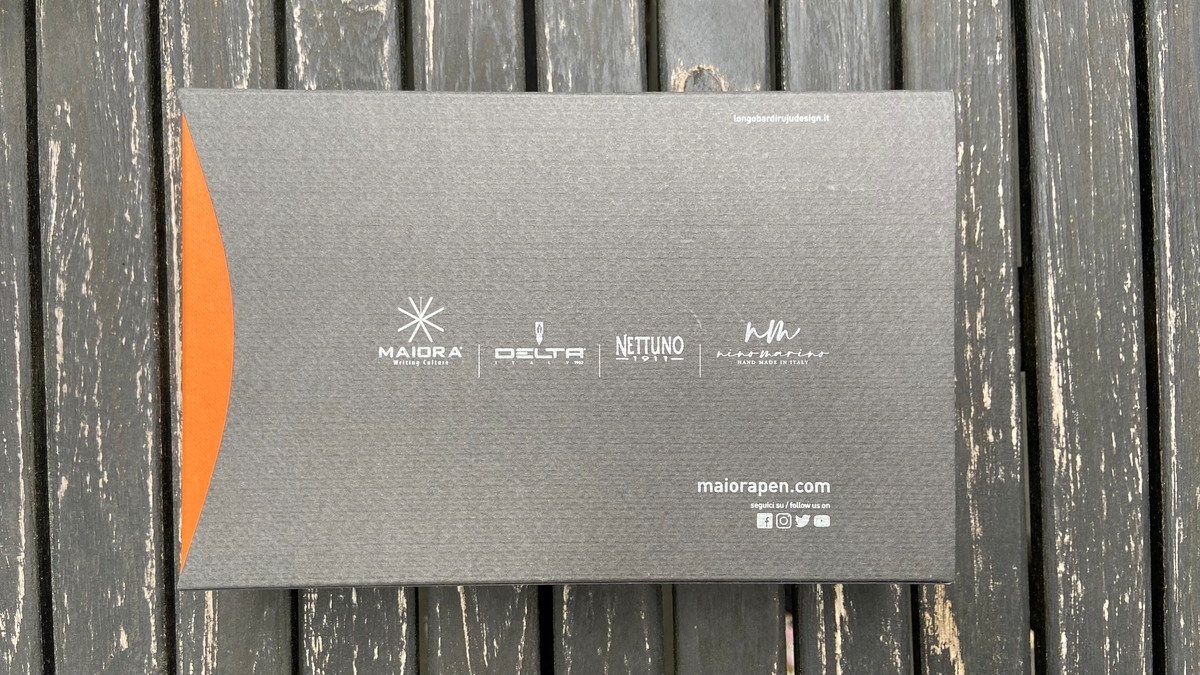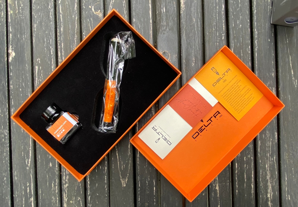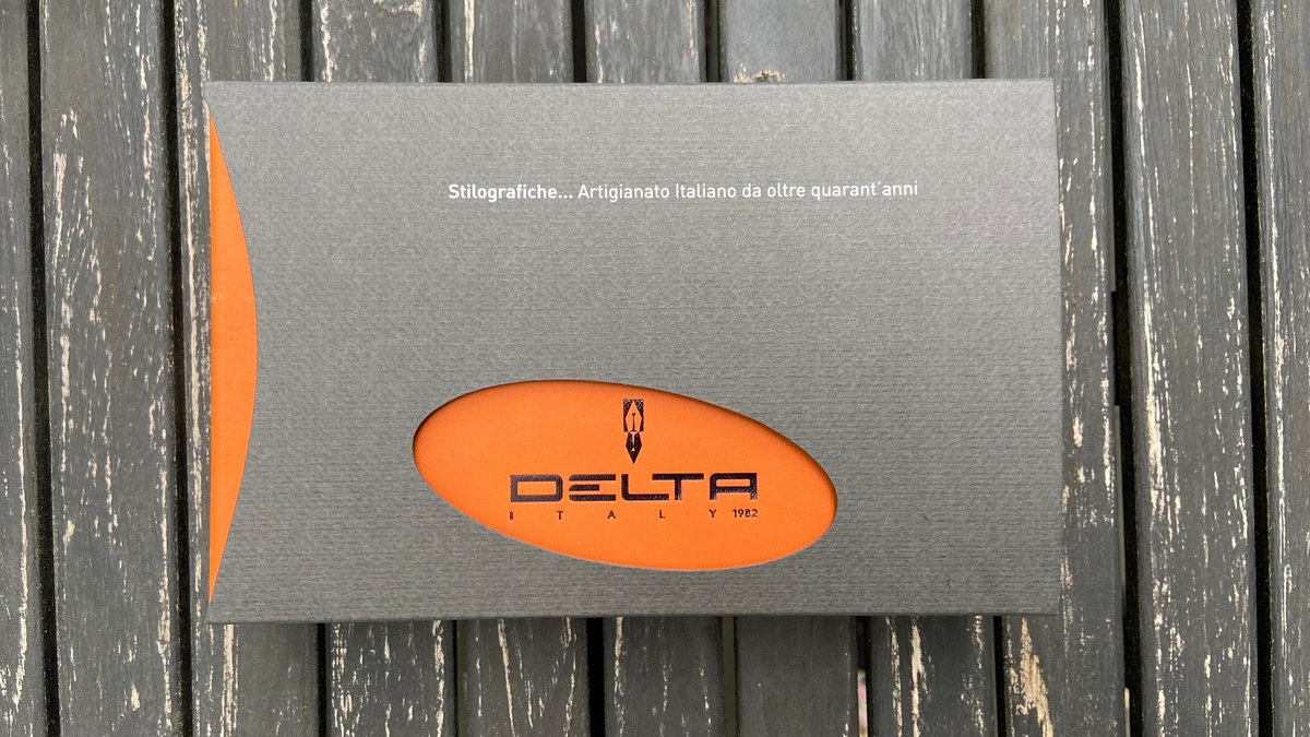 Перьевая ручка Delta Write Balance прибыла ко мне в шикарной упаковке — оранжевого цвета прочной коробке, обёрнутой тёмно-серой обечайкой с овальной прорезью, через которую видно название компании-производителя.