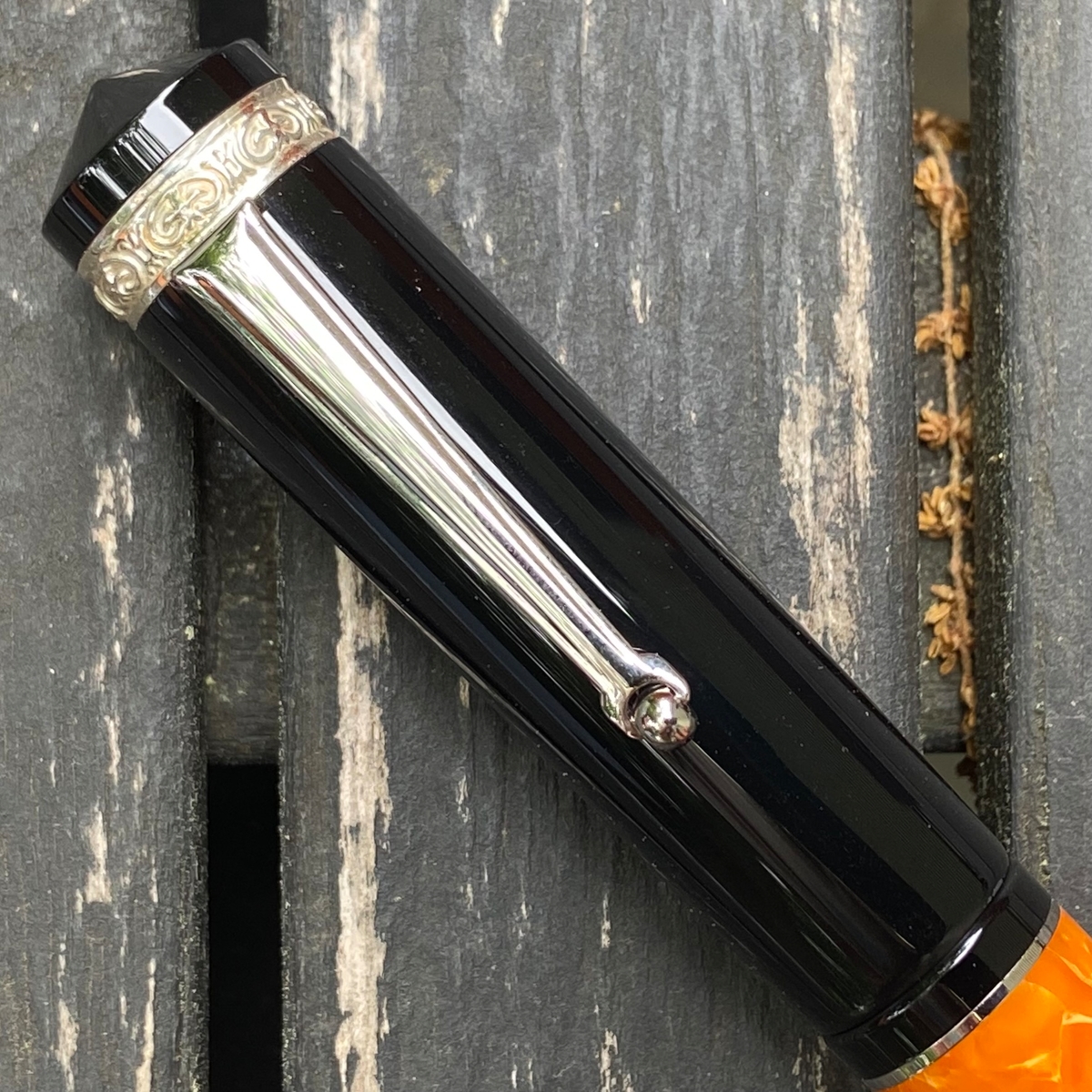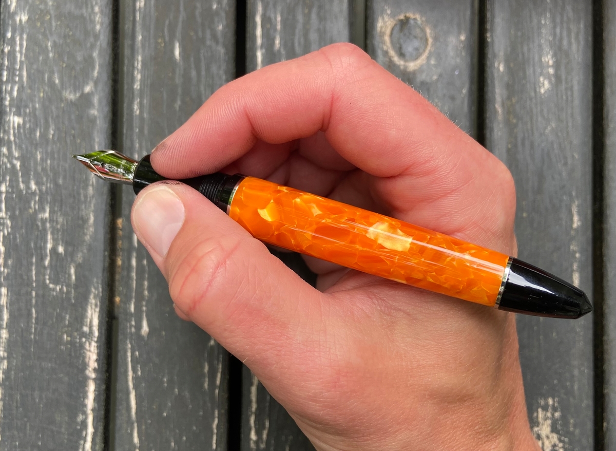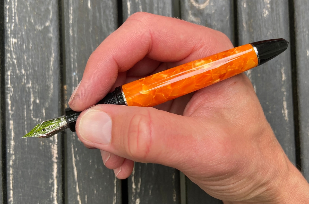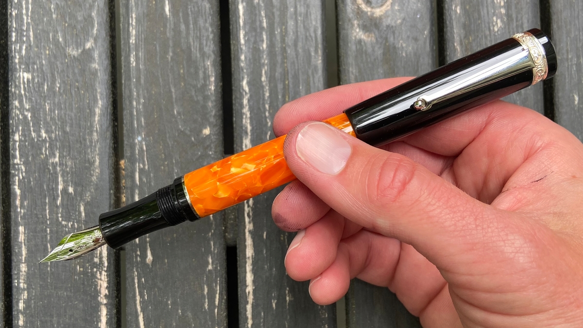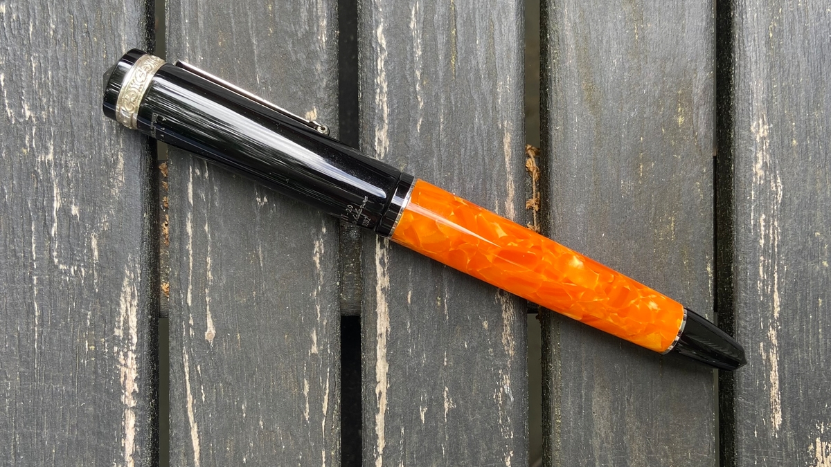 Дизайн ручки, на мой взгляд, великолепен: и форма, и сочетание цветов. Этот огненно-оранжевый акрил в обрамлении глянцевого чёрного пластика с изящной серебристой фурнитурой — чудо!