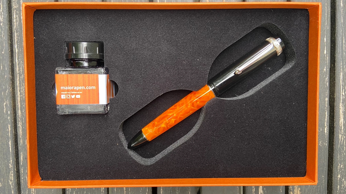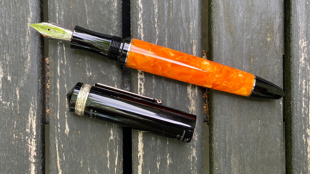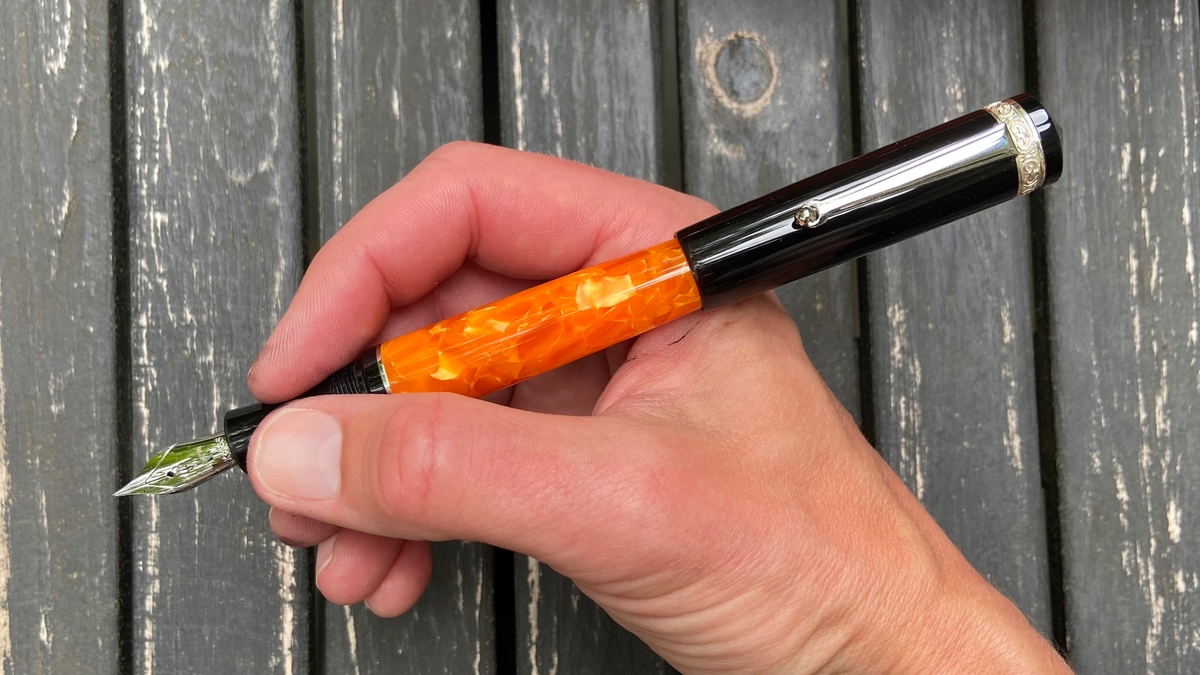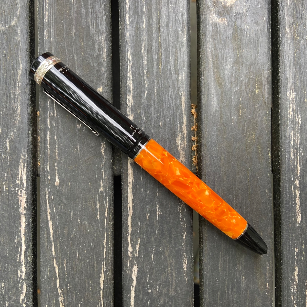 Дизайн ручки, на мой взгляд, великолепен: и форма, и сочетание цветов. Этот огненно-оранжевый акрил в обрамлении глянцевого чёрного пластика с изящной серебристой фурнитурой — чудо!