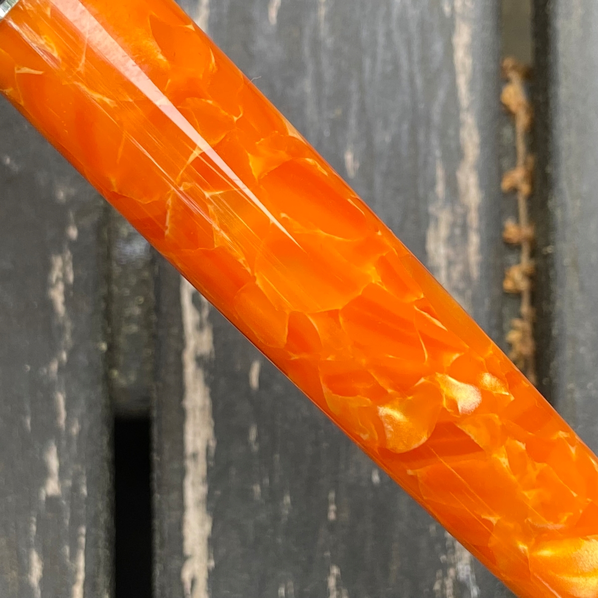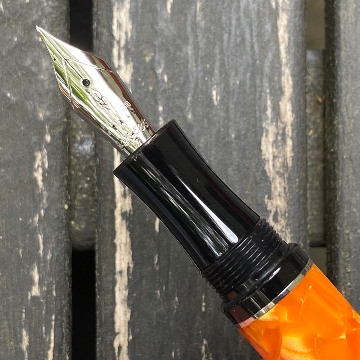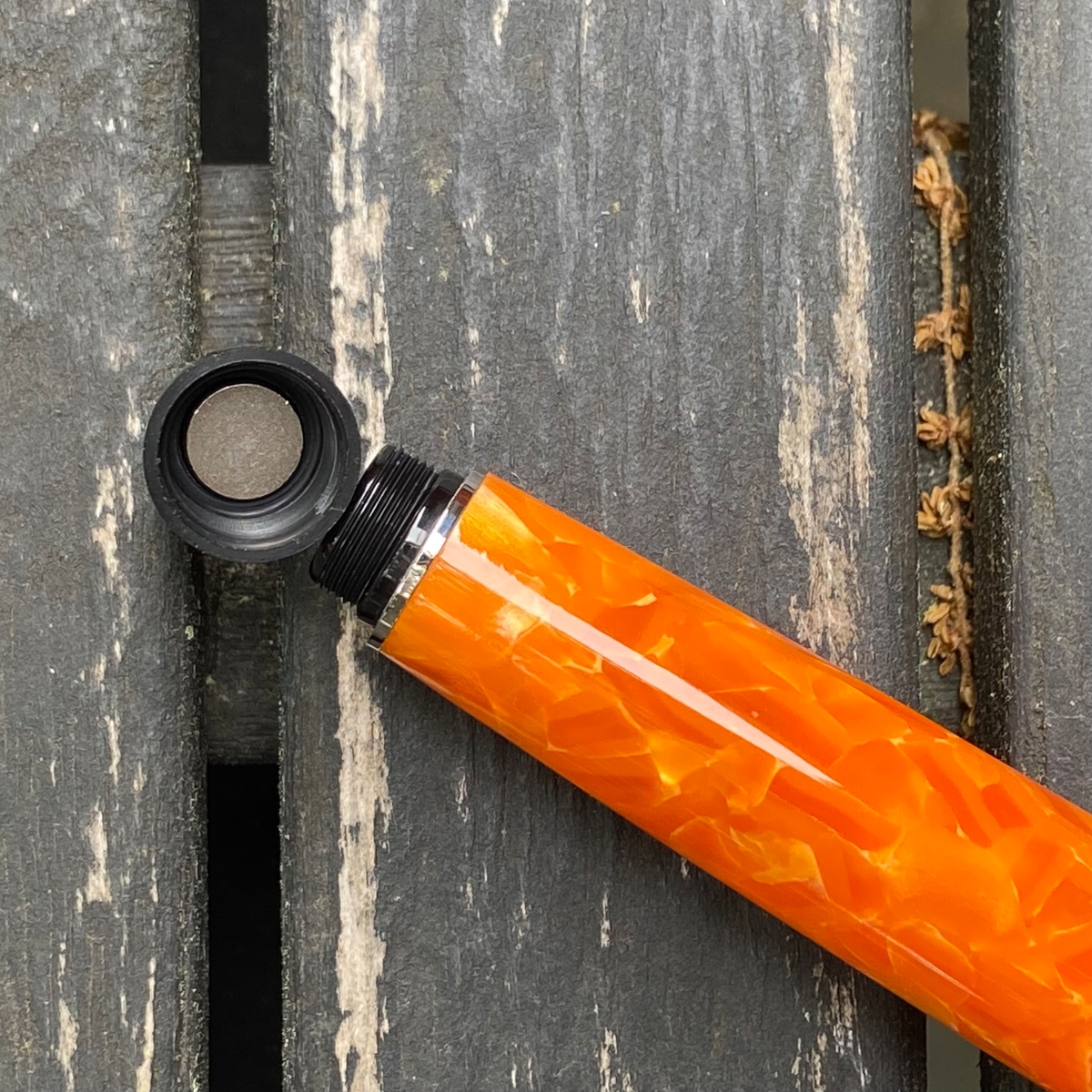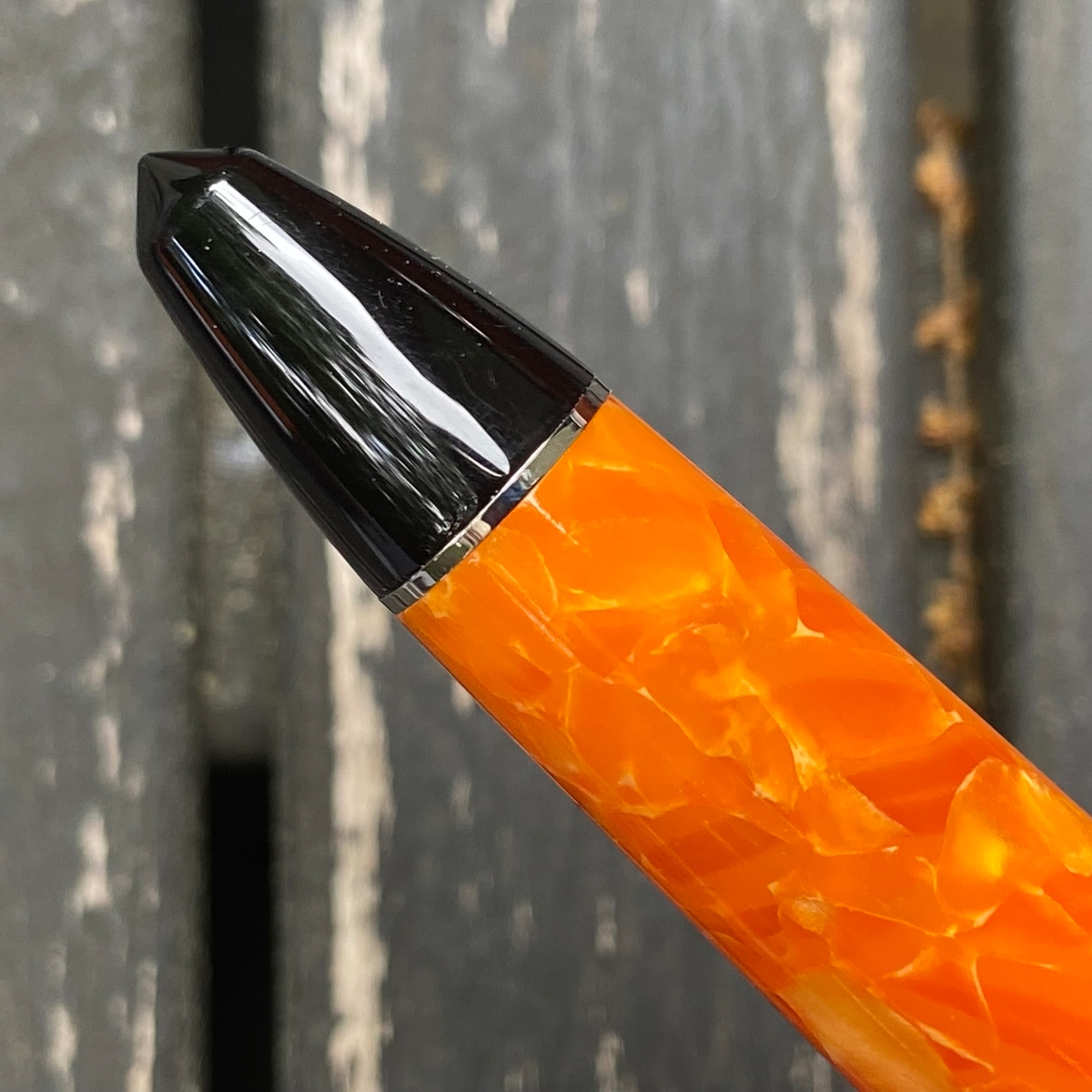 Дизайн ручки, на мой взгляд, великолепен: и форма, и сочетание цветов. Этот огненно-оранжевый акрил в обрамлении глянцевого чёрного пластика с изящной серебристой фурнитурой — чудо!