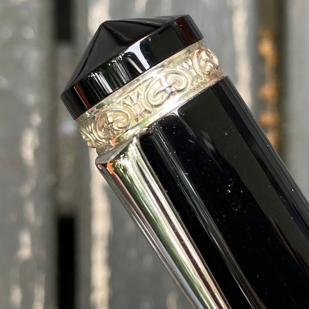 Невероятно играет на свету и здорово сочетается с чёрным навершием корпуса и серебристым кольцом.