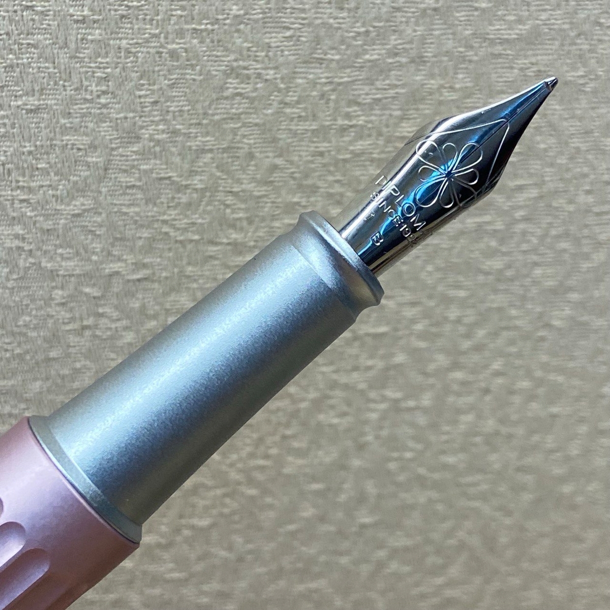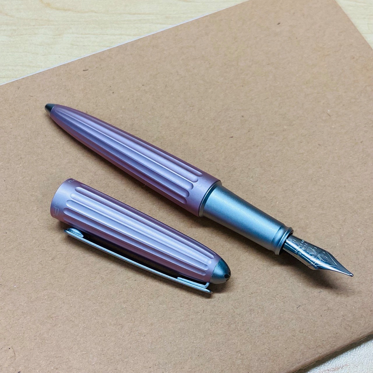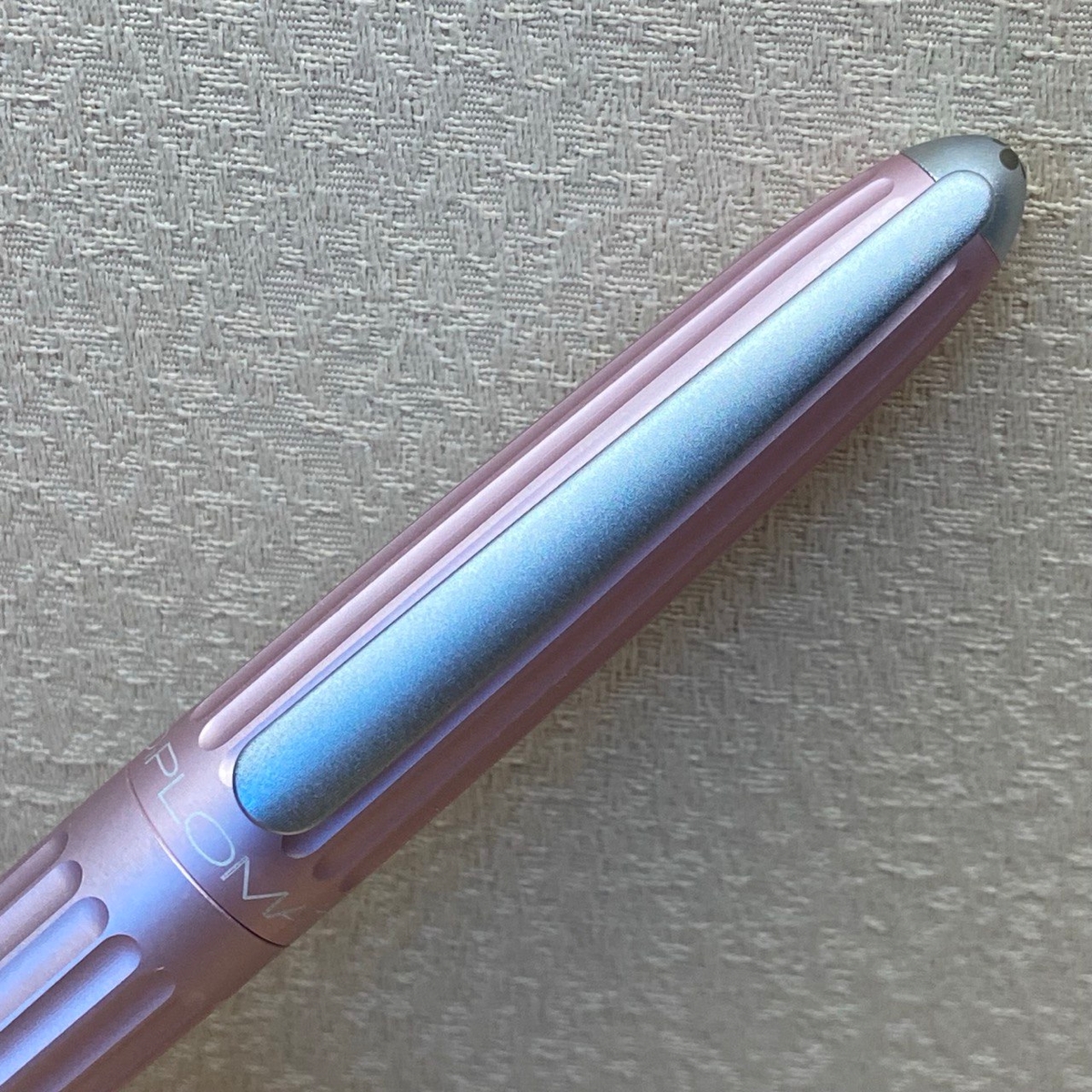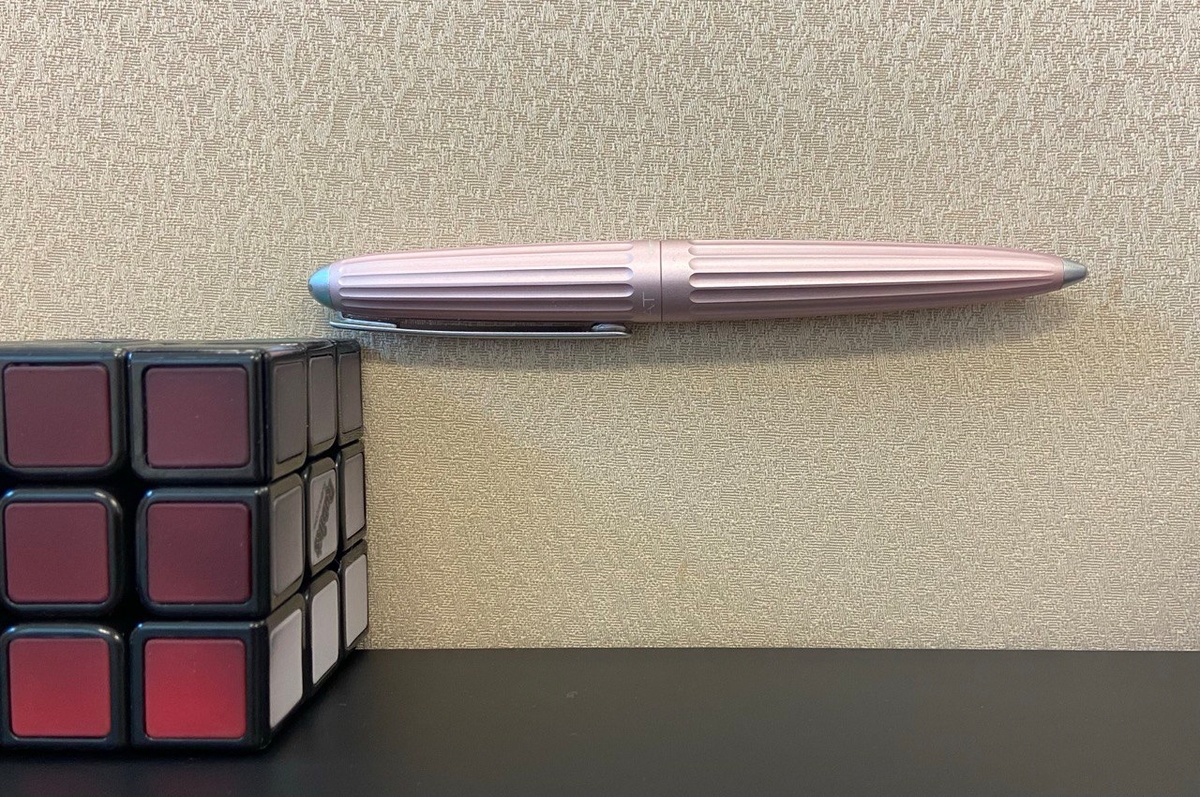 Забавно, в одном из «перьевых» чатов Diplomat Aero в перламутрово-розовом цвете, как у меня, окрестили «Барби-пулей». :) Насчёт Барби понятно, а пуля — за специфические навершия на торцах. На корпусе эта серебристая вставка чуть тоньше, чем на колпачке: корпус сам по себе сужается сильнее.