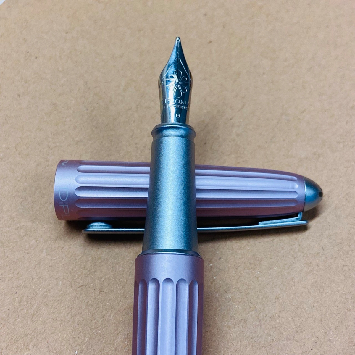На нём выгравированы лого, имя и дата основания компании, а также размерность — B (то есть Broad). Доступны перья и в размерах EF, F, M.