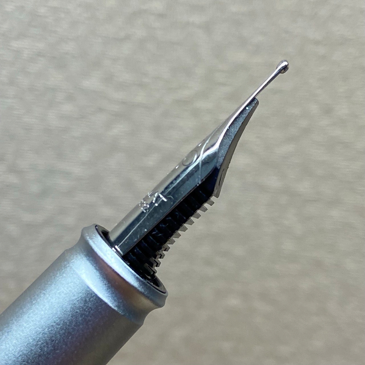 Под колпачком, помимо пера, скрывается алюминиевая слегка брашированная секция — та самая притча во языцех: сужается к перу, имеет небольшую канавку в нижней части и большую ступеньку на границе с корпусом.