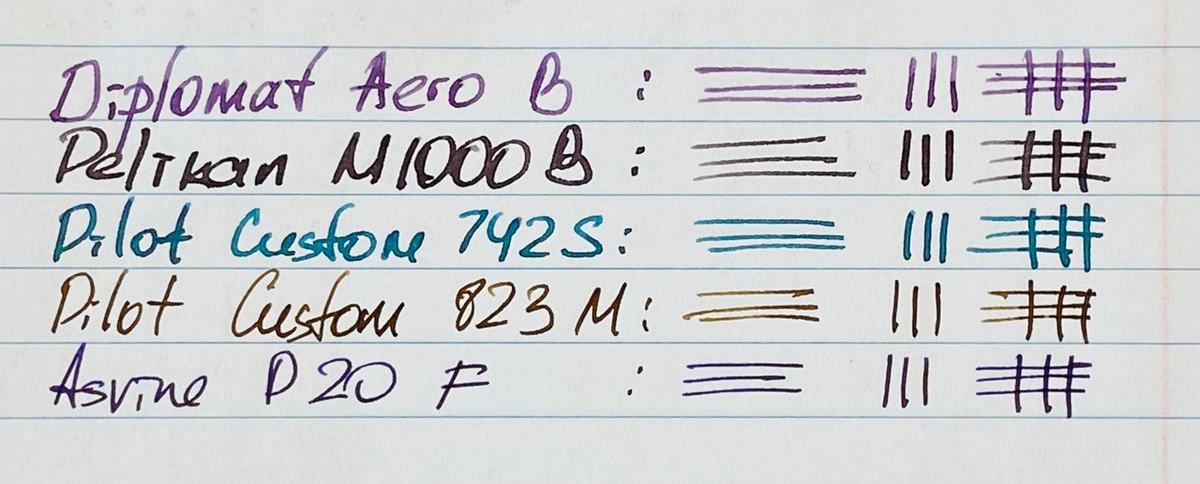 Ещё сопоставил с пером S от Pilot (это недавно возобновлённое Signature nib — толстое перо для важных подписей), M от Pilot, ну и китайскую F-ку тоже не забыл.