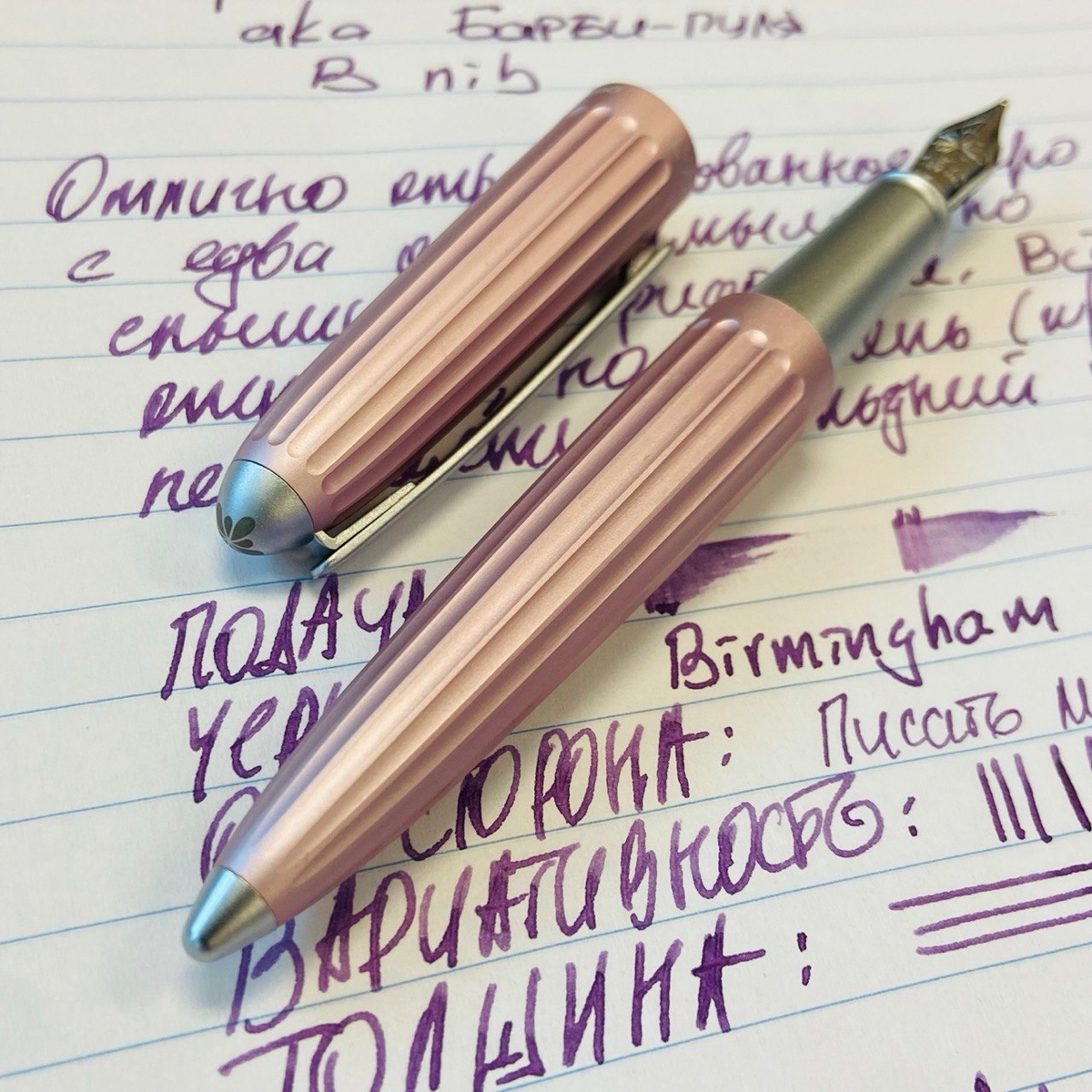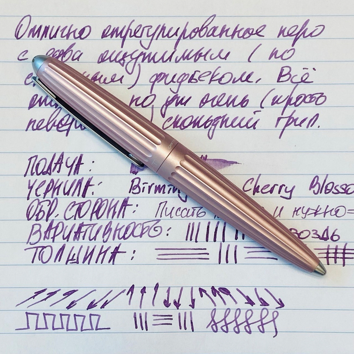 А как раскрылись чернила благодаря перу Diplomat Aero! Мои относительно блёклые Birmingham Cherry Blossom проявили себя во всей красе, заметен даже шейдинг — неравномерное распределение цвета.