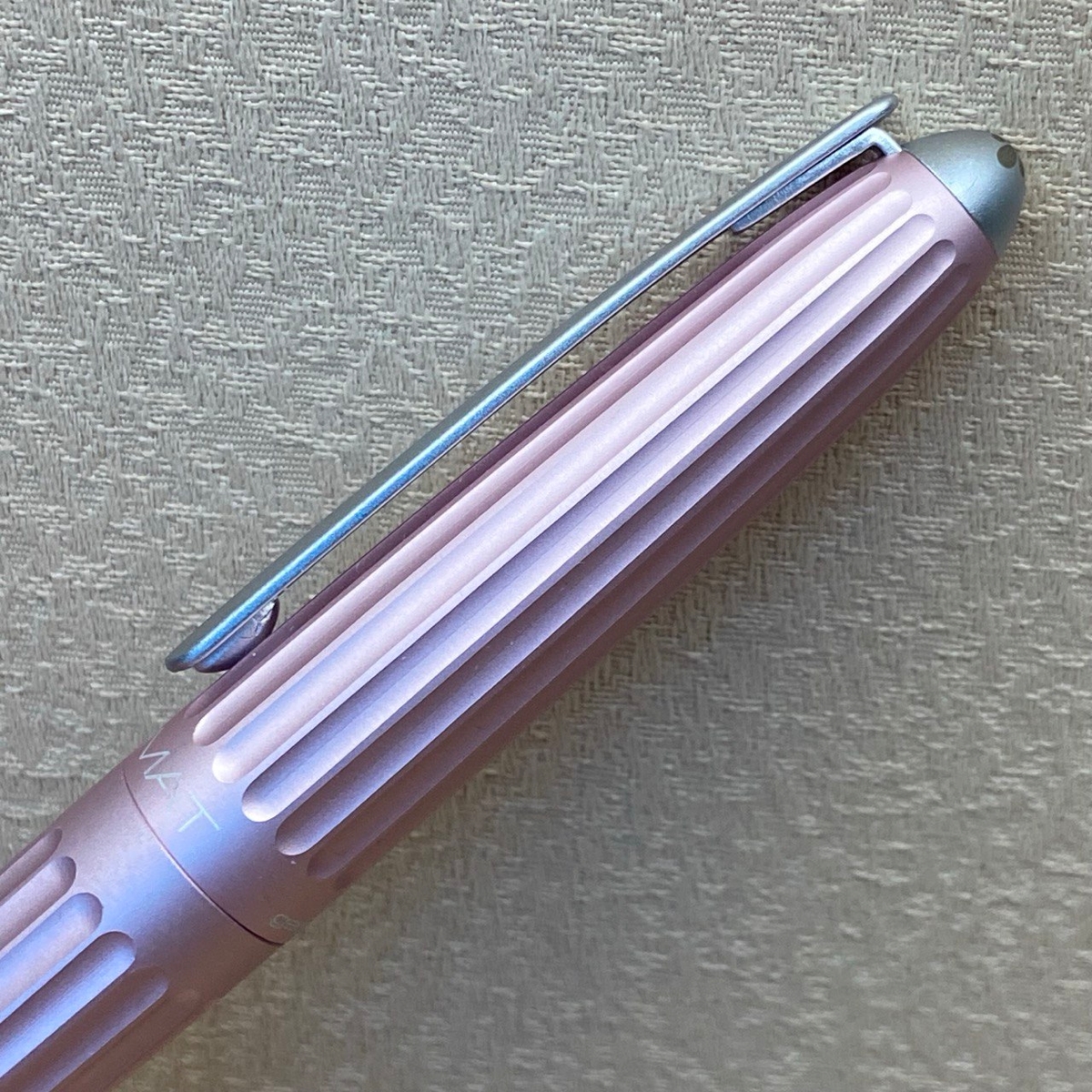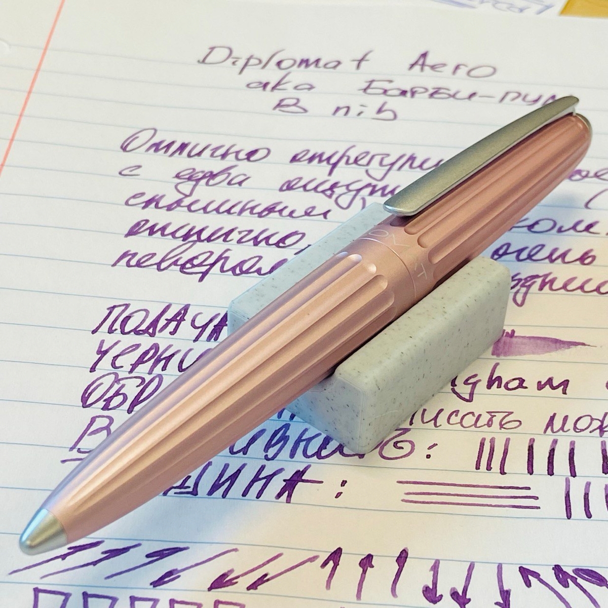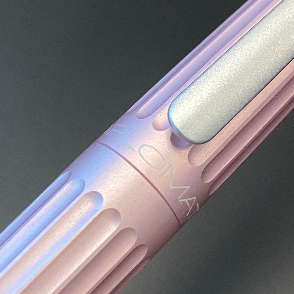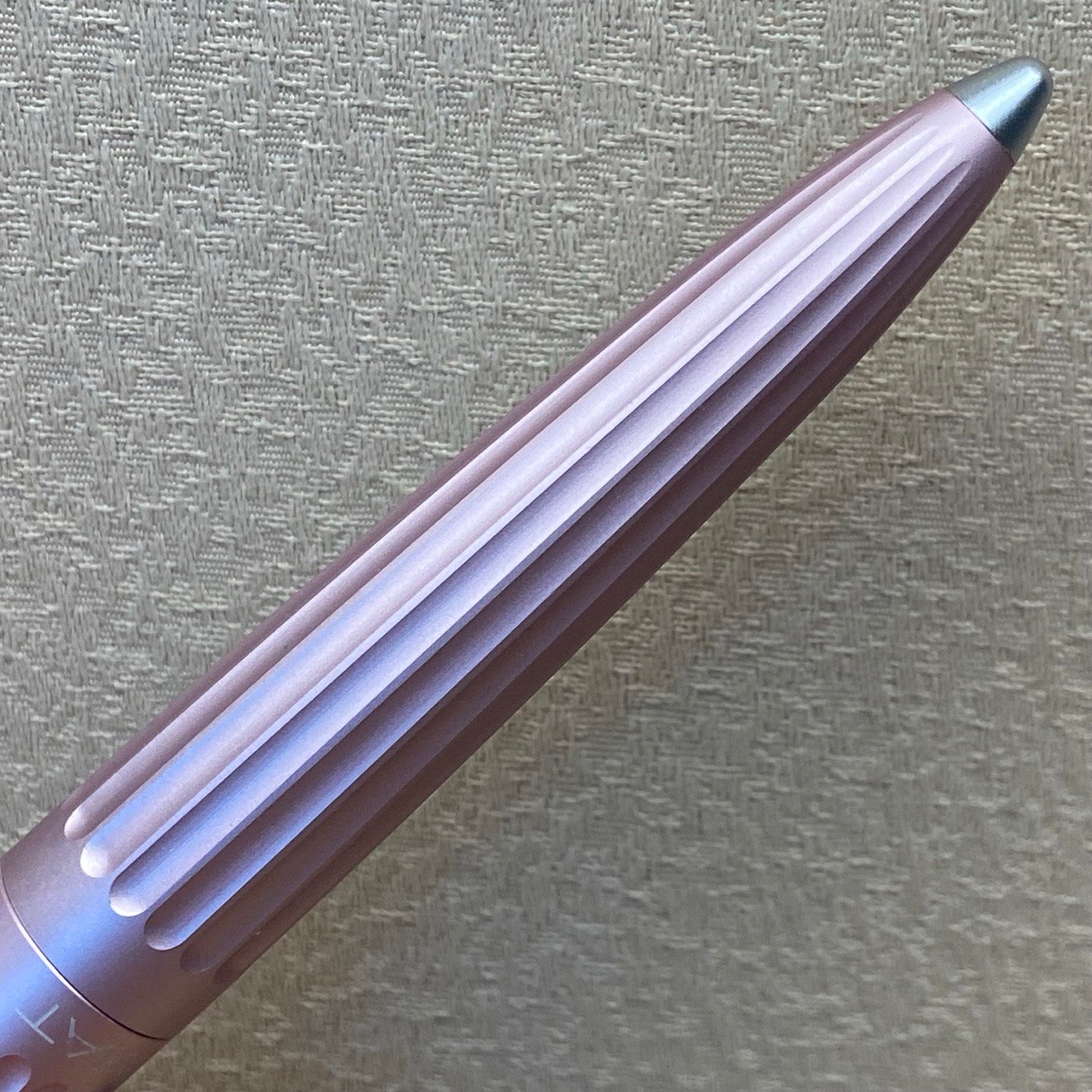 Забавно, в одном из «перьевых» чатов Diplomat Aero в перламутрово-розовом цвете, как у меня, окрестили «Барби-пулей». :) Насчёт Барби понятно, а пуля — за специфические навершия на торцах. На корпусе эта серебристая вставка чуть тоньше, чем на колпачке: корпус сам по себе сужается сильнее.