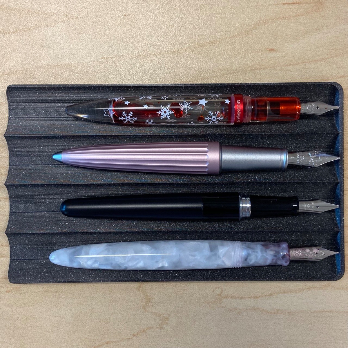 На нём выгравированы лого, имя и дата основания компании, а также размерность — B (то есть Broad). Доступны перья и в размерах EF, F, M.