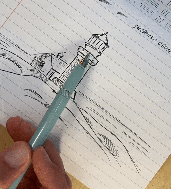 Подача на удивление умеренно-обильная. Нажимать на него по классике не стоит совершенно. Никаких царапаний, прерываний линий, проблем с хардстартами и подачей нет. Обратной стороной перо тоже пишет (напомню, это фича, а не опция).
