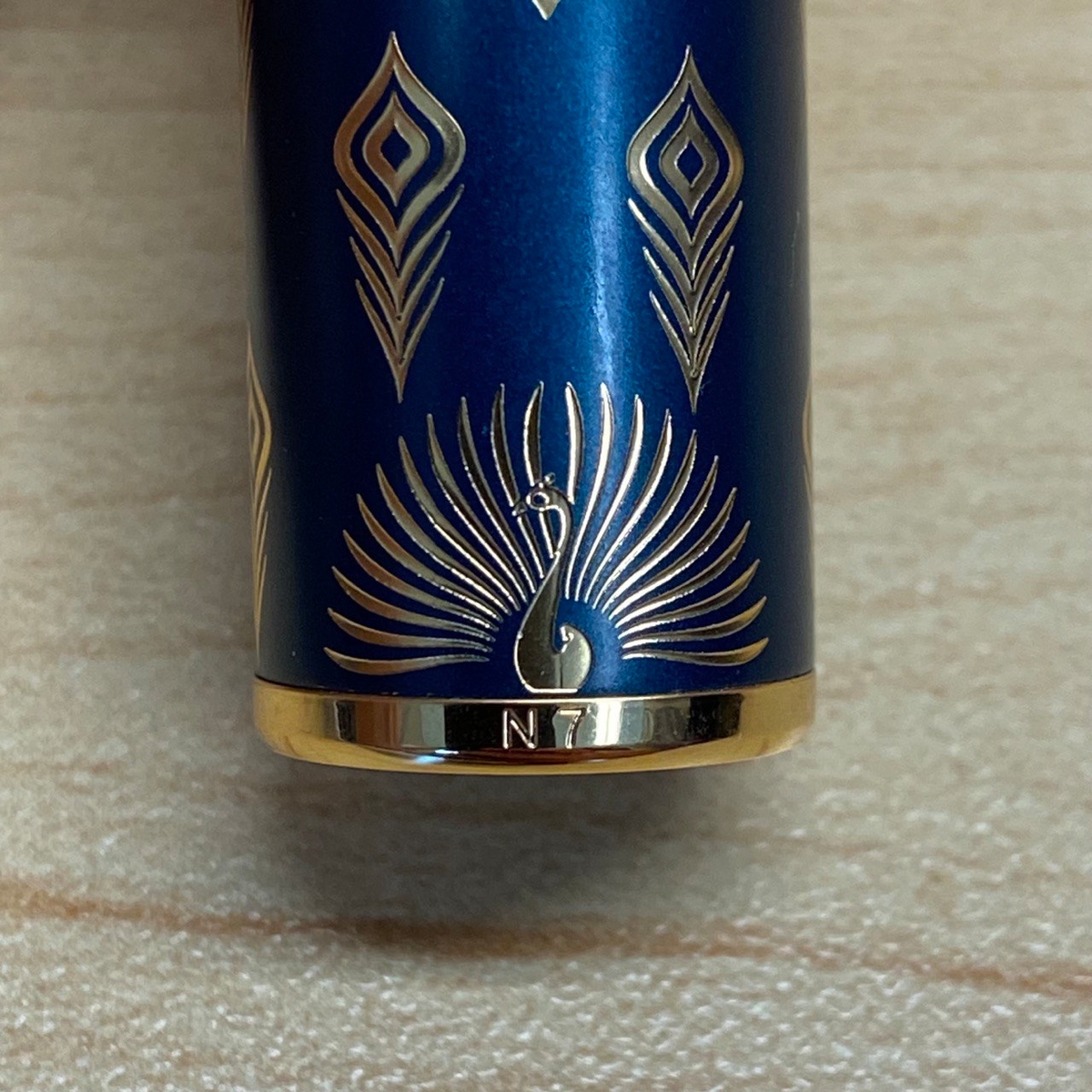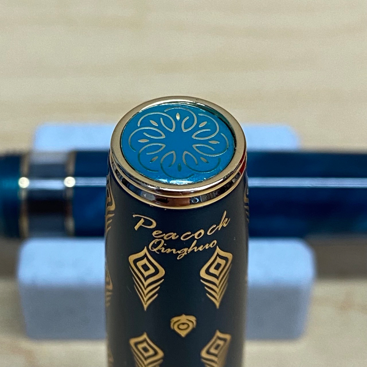Что касается самого колпачка, то его торец украшен виниловым медальоном с восточными узорами, сбоку присутствует надпись Peacock Qinghuo, внизу — на золотистом кольце — павлин, название модели N7 на одной стороне и LT HONGDIAN на другой, вся поверхность усыпана изображениями павлиньих перьев.