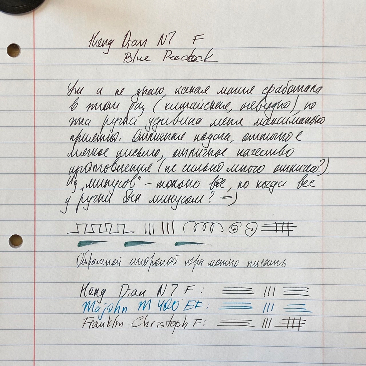 Пишет перо изумительно, я каждый раз удивляюсь его мягкости! Хорошая, честная F-ка, обильная подача, минимум фидбэка, никаких пропусков и хардстартов.