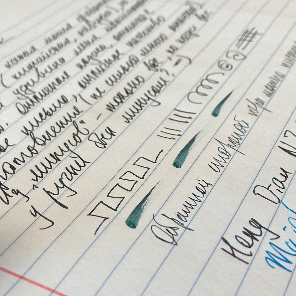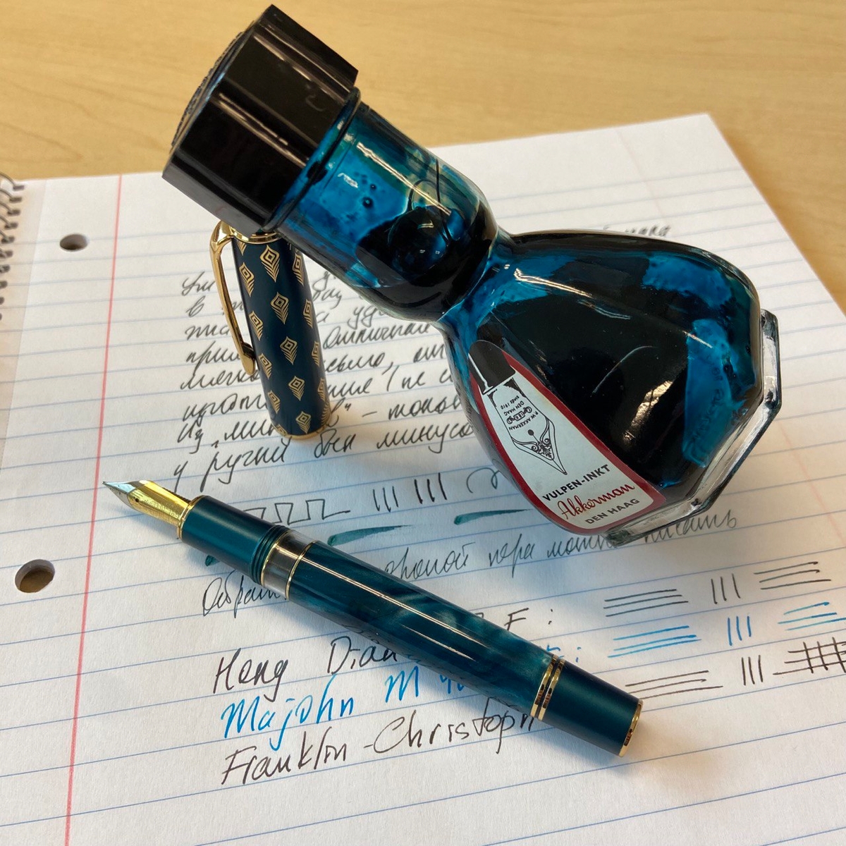 Чернила — Akkerman 24, и выбраны они были не случайно: их тёмно-сине-зелёный оттенок идеально подошёл к цвету ручки.