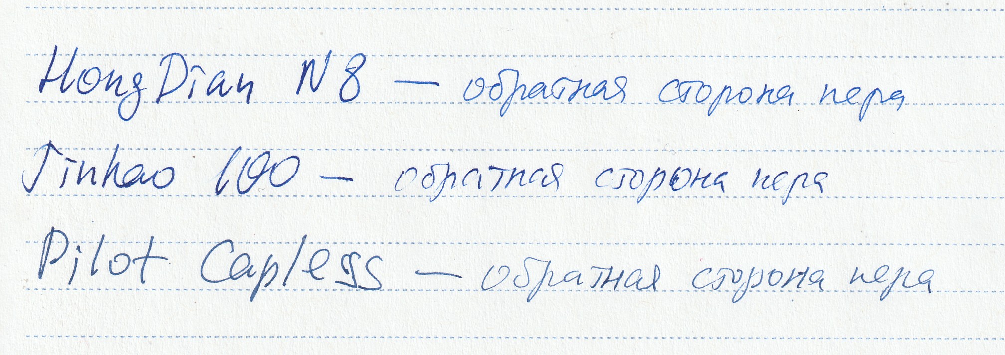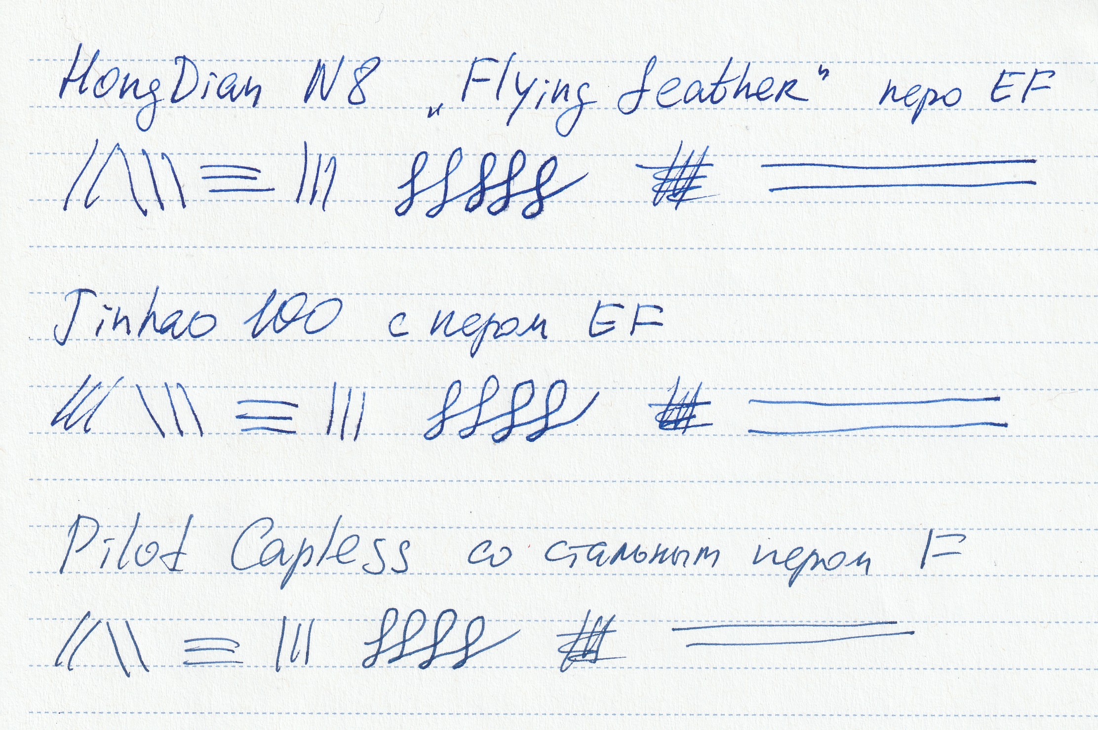 Я заправил HongDian чернилами Majohn Royal Blue (очень их рекомендую, из минусов — только нулевая водостойкость) и провёл прямое сравнение письма с Pilot Capless (установлен родной картридж Blue-Black) и Jinhao 100 (кажется, здесь тоже Majohn Royal Blue):