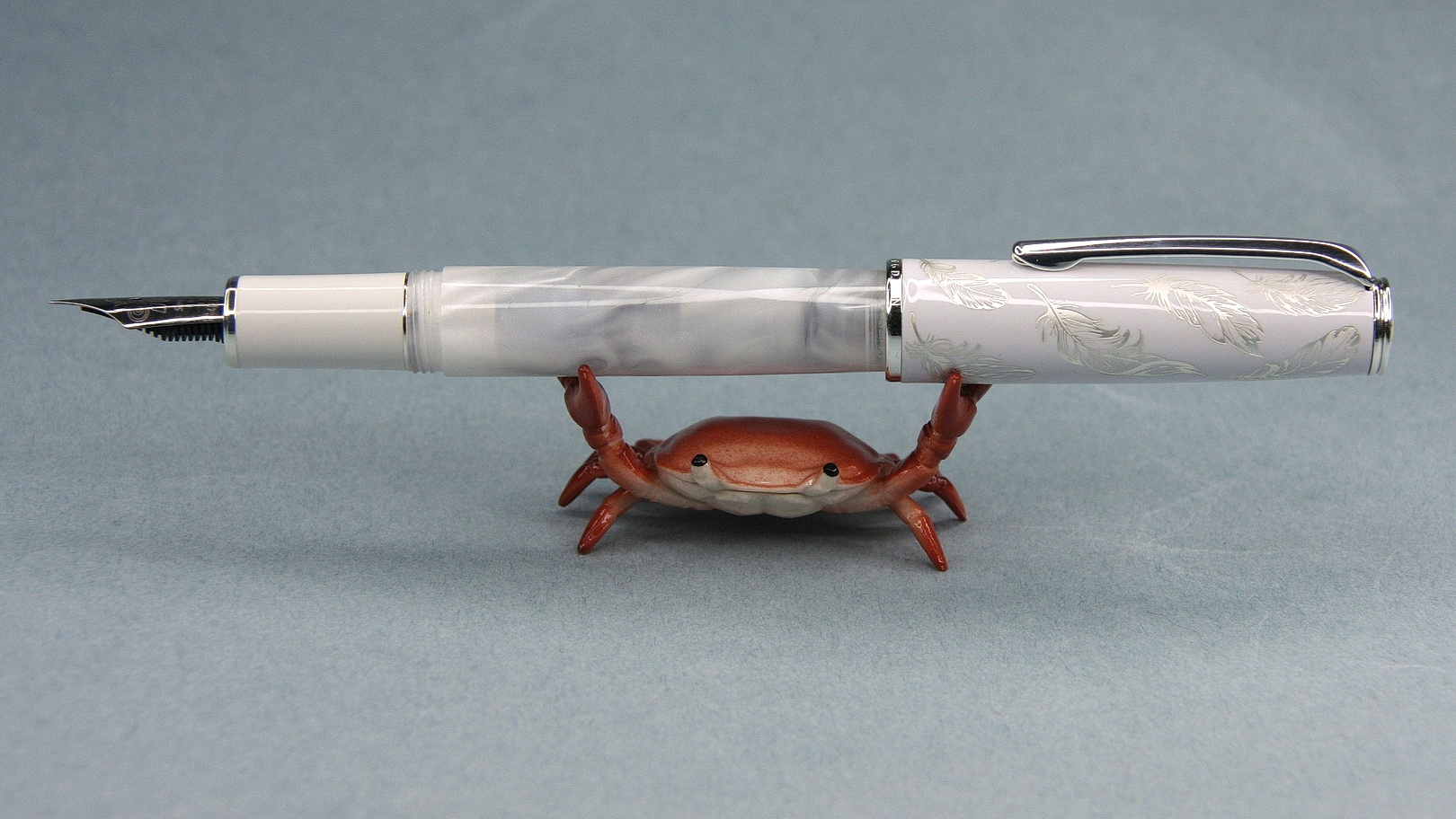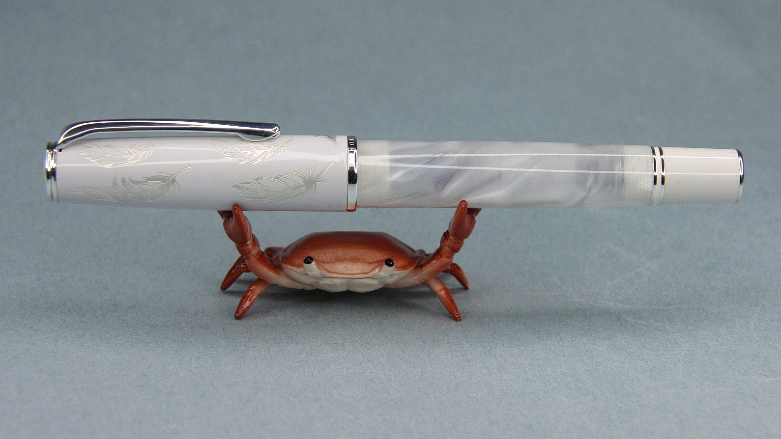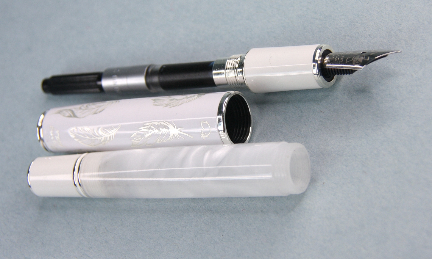 Flying feather с английского переводится как «Летящее перо», что подтверждает оформление: на белом колпачке серебристые перья, а расцветка барреля словно имитирует движение облаков.