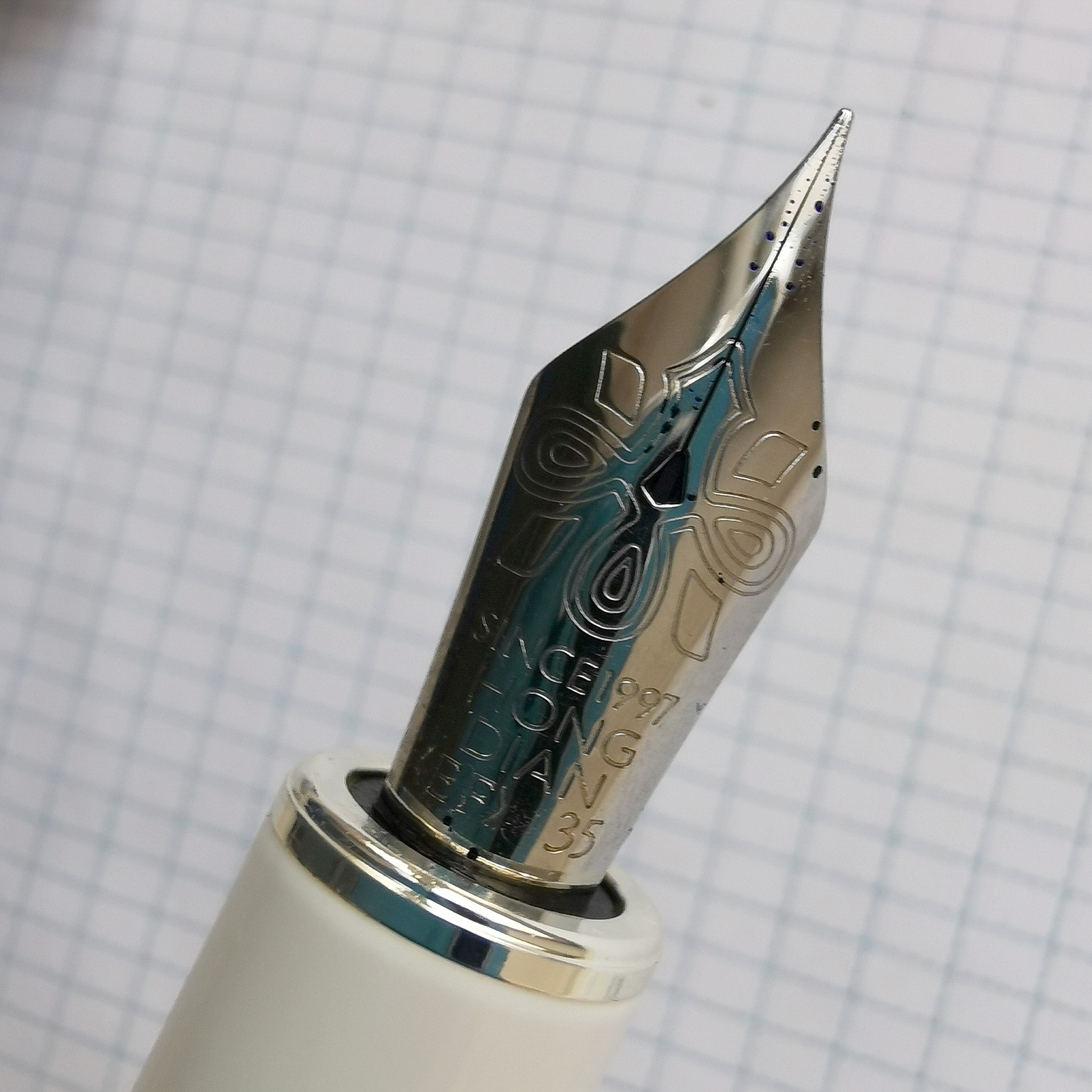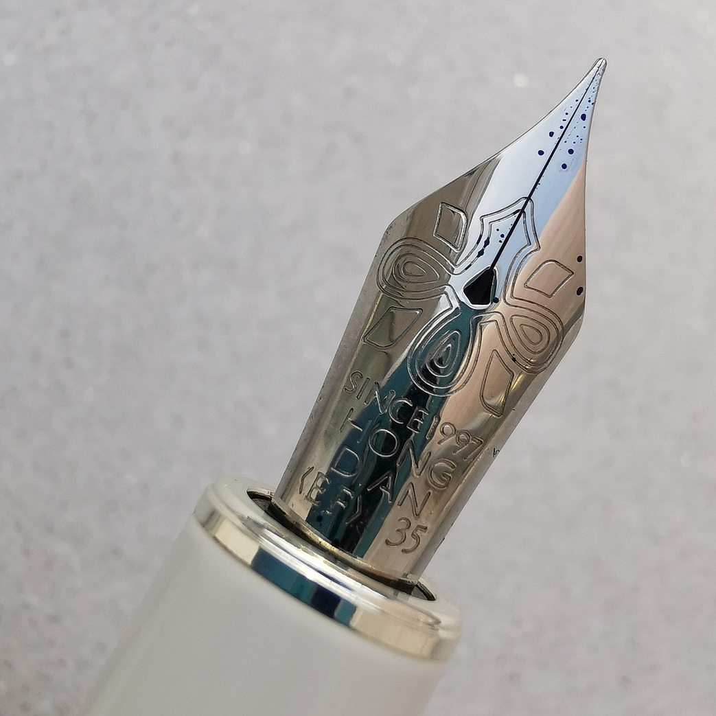 Вообще, буду активно хвалить это перо! Линия — честная японская EF, подача ближе к обильной, поэтому пишет ручка тонко и насыщенно — способна раскрыть и не слишком выразительные чернила, я думаю. Оно может на равных потягаться со стальными японцами!