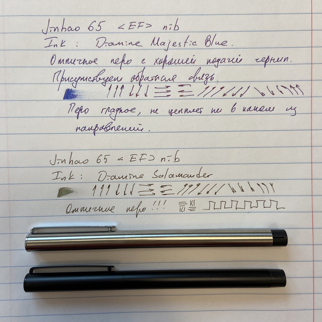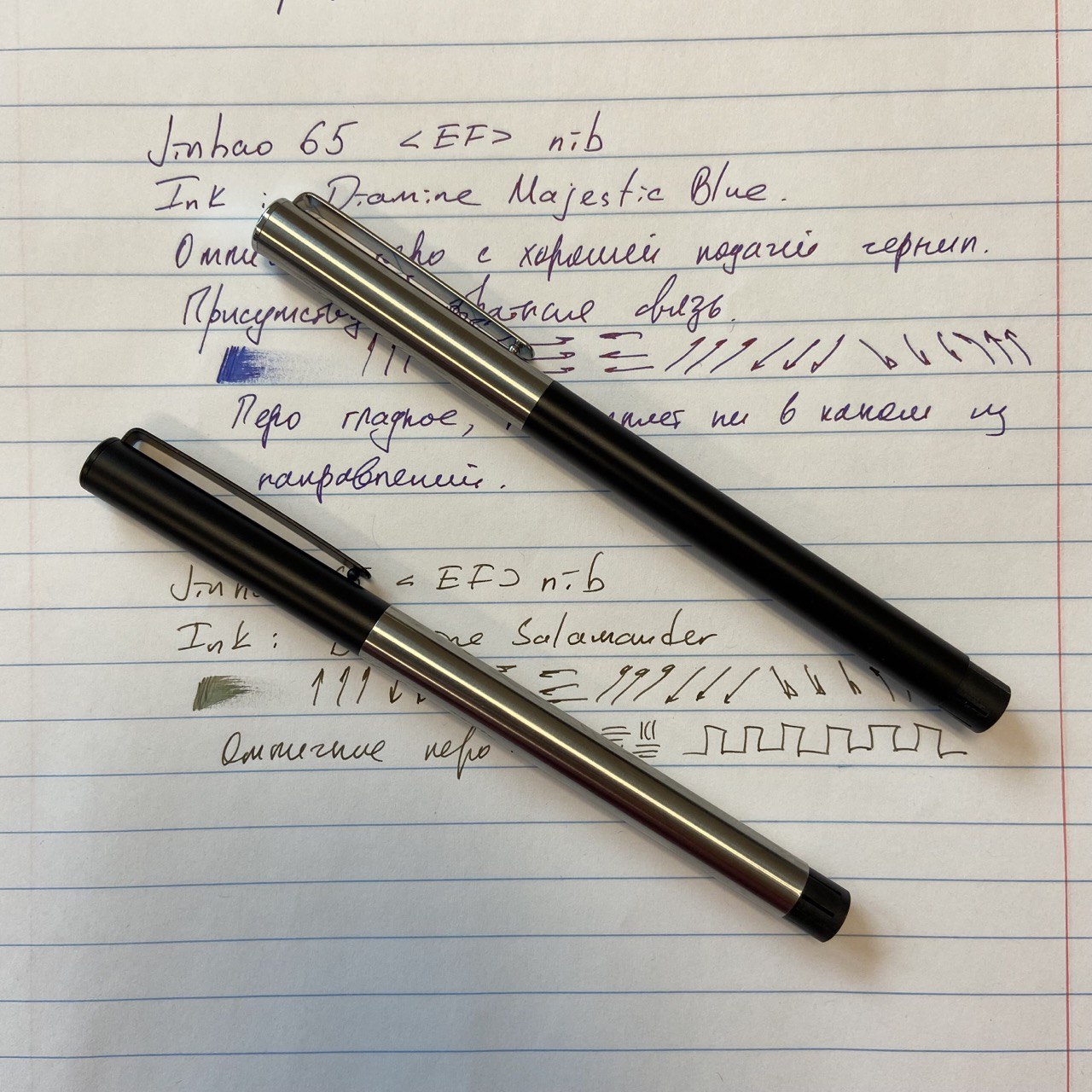 Жёсткие, с обратной связью и типичным шуршанием (дискомфорта это не вызывает). Удивила ширина линии — действительно EF. Вариативности ожидать не стоит. Пишут гладко, разве что обратной стороной чуть подцарапывая бумагу (толщина линии при этом — super UEF). Обе ручки записали мгновенно, безо всяких промываний после заправки чернилами.