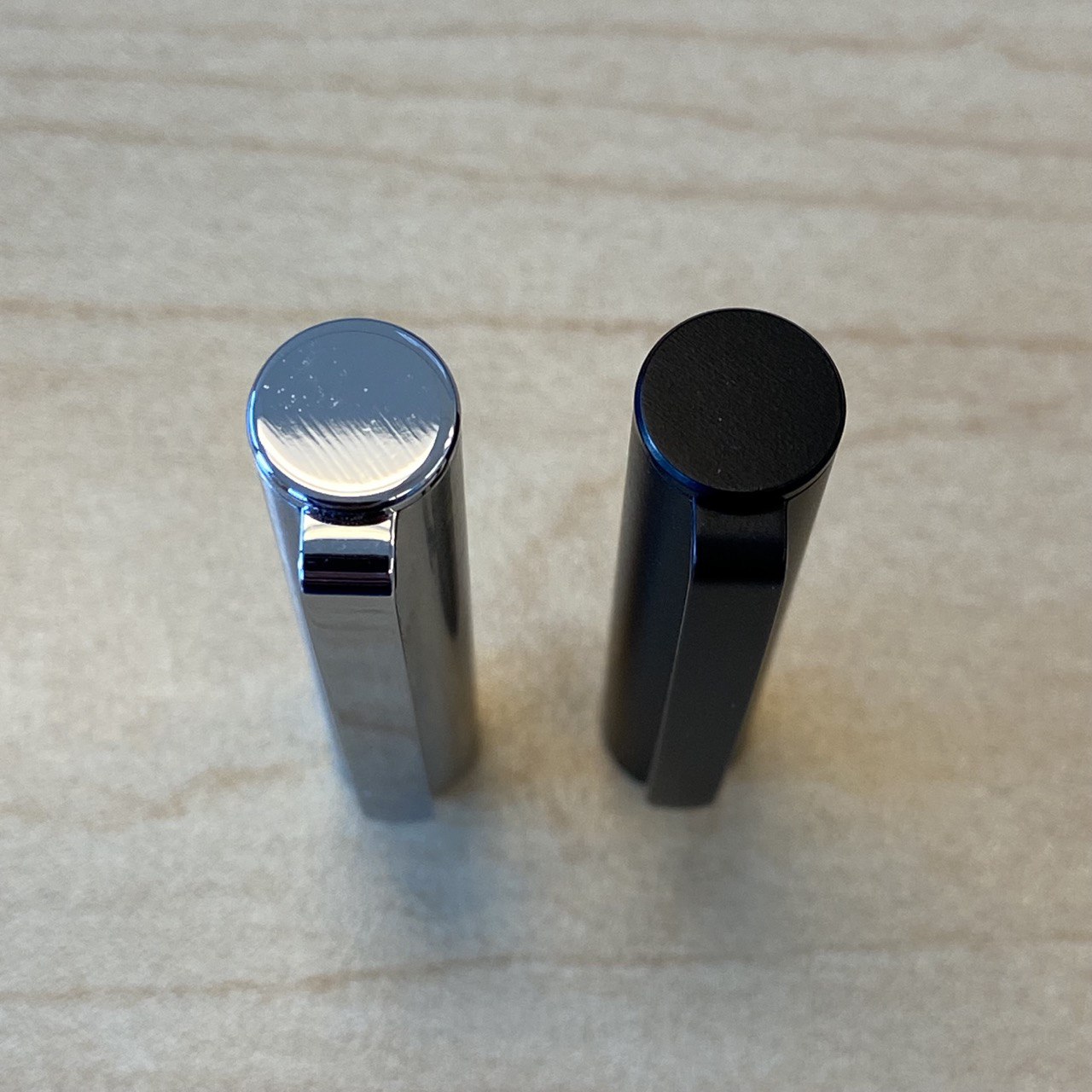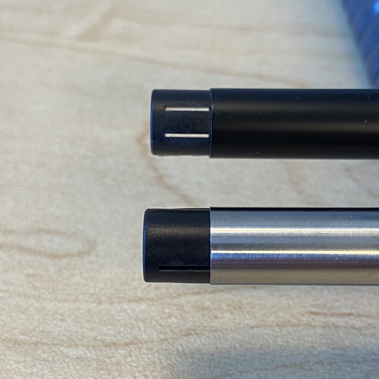 - обе имеют плоские навершия на колпачке и барреле, а также защёлкивающиеся колпачки.