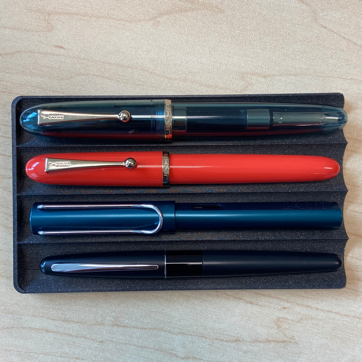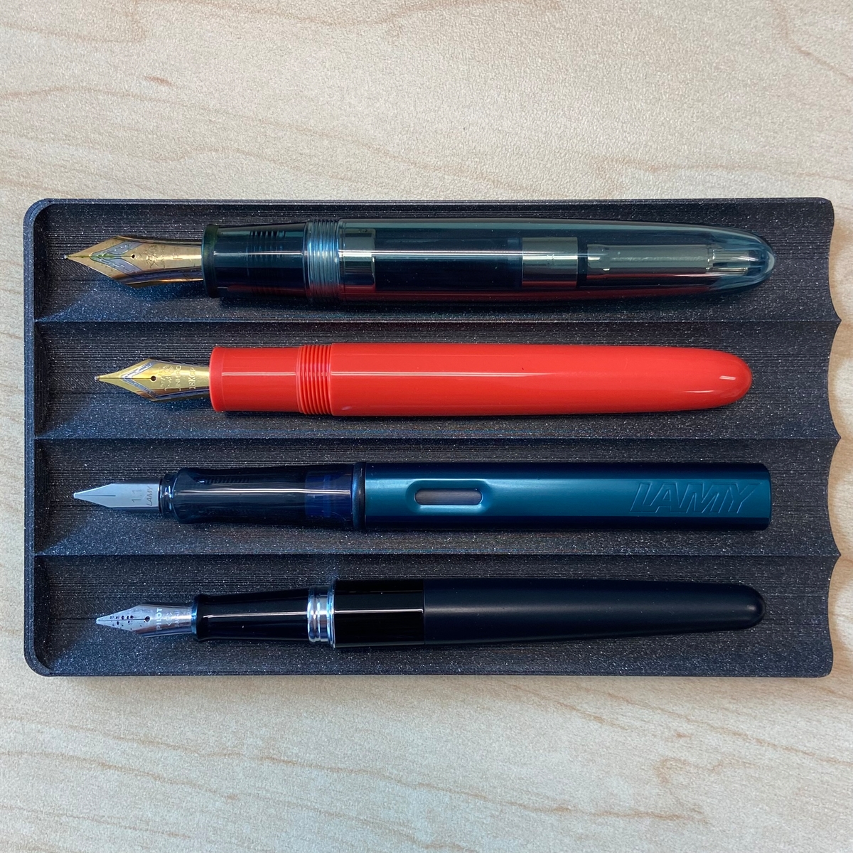 Сравним габариты. Так героиня обзора выглядит на фоне старшей сестры Jinhao 9019, Lamy Al-Star и Pilot Metropolitan. Размер всё ещё впечатляющий.