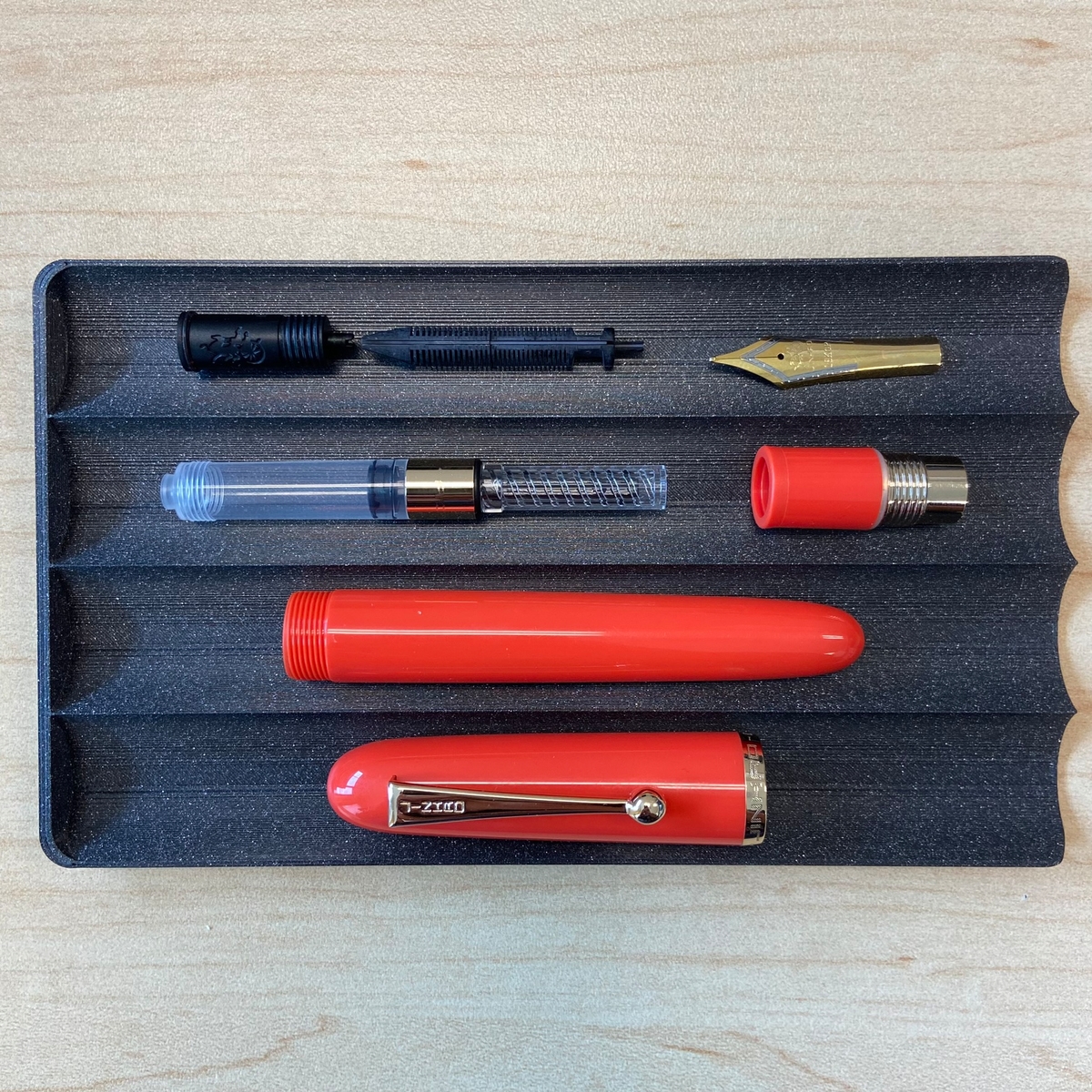 На ощупь Jinhao 9016 производит впечатление добротного изделия, но, если её потрясти, внутри нечто еле заметно гремит — крепление рукоятки конвертера оставляет желать лучшего.