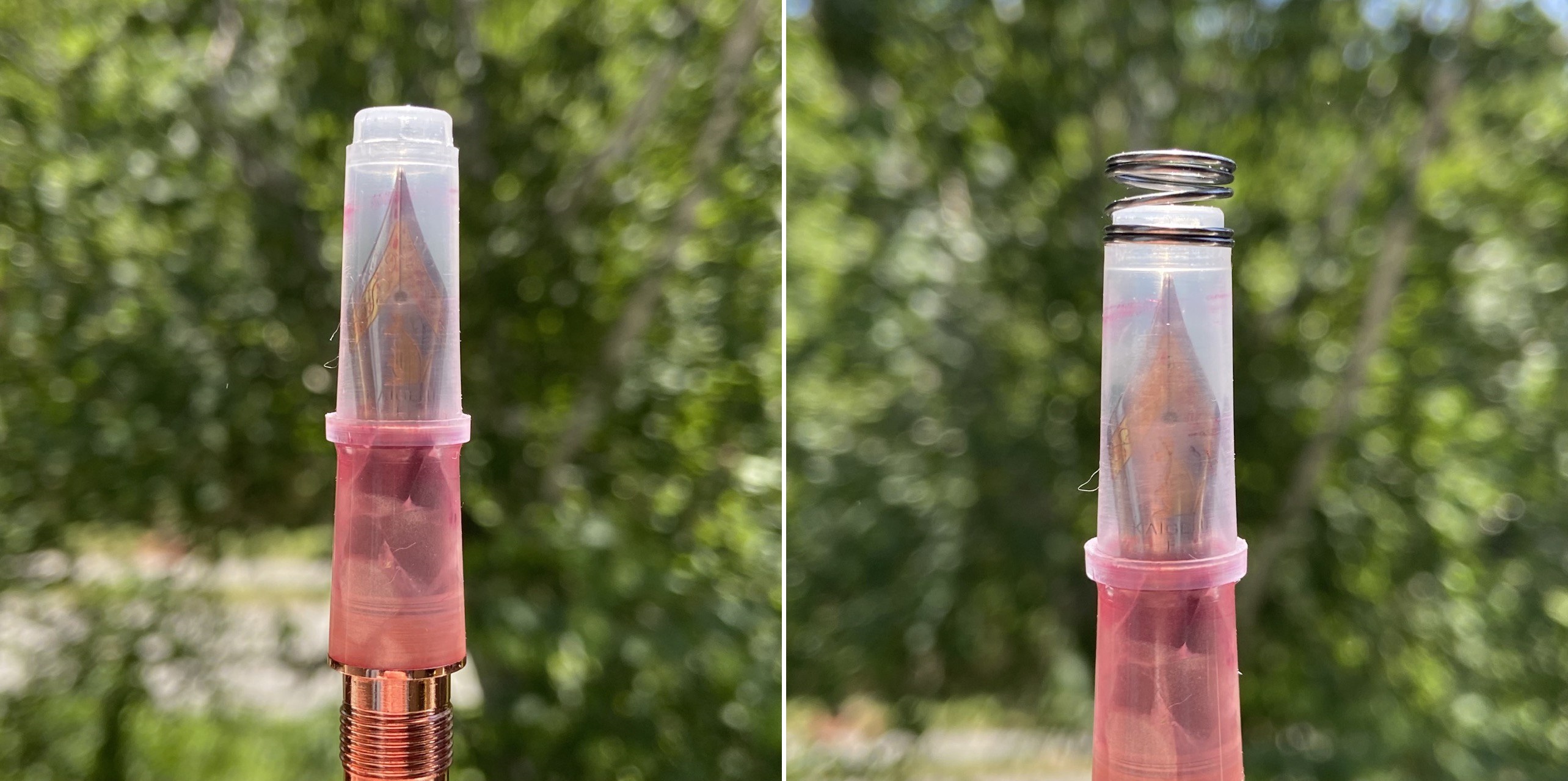 Оказывается, внутри колпачка присутствует уже знакомая мне по ручкам Platinum система Slip & Seal — ещё один подпружиненный колпачок, который по-максимуму перекрывает доступ воздуха к перу.