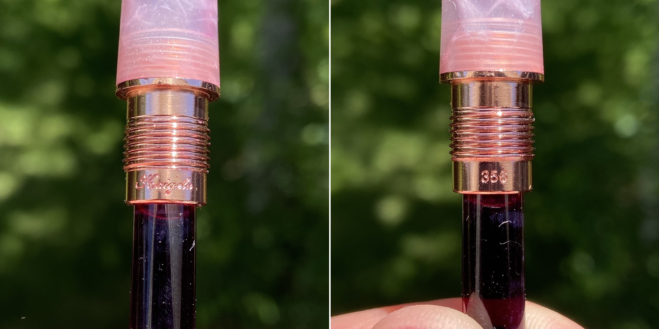 Кстати, у Kaigelu 356 есть прикольная фича: чтобы заправить конвертер, необязательно откручивать корпус, можно снять навершие ручки и получить доступ к рукоятке конвертера. Уровень чернил легко просматривается на просвет.