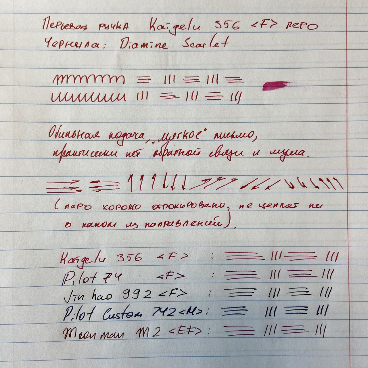 Пишет довольно мягко для стального, не царапает ни в одном из направлений. С еле заметной обратной связью. Не шумит. Стабильная линия восточной ширины F (между 0,4 и 0,5 мм). Подача чернил умеренно-обильная, инструмент явно не из сухих.