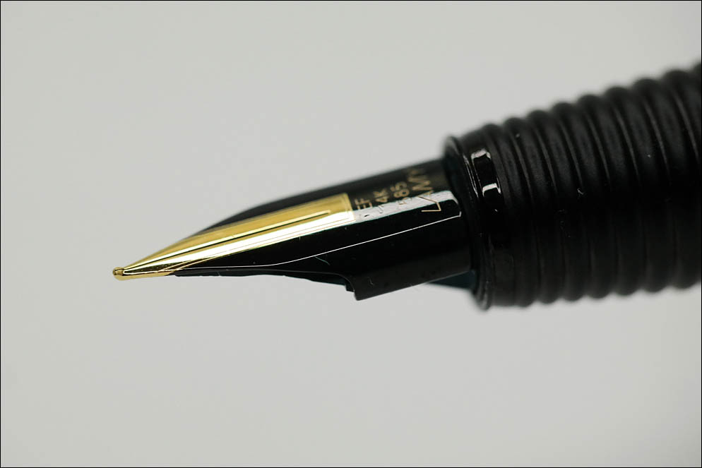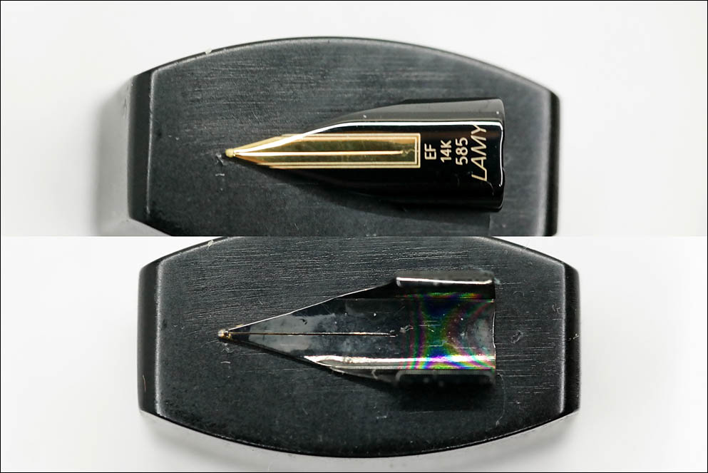 Золотое, 14-каратное. Это старшее перо Z58 типовой современной линейки Lamy Z. Покрыто глянцевым чёрным лаком, за исключением окончания и линии распила половинок. На поверхности надписи: EF, 14K, 585 и LAMY.