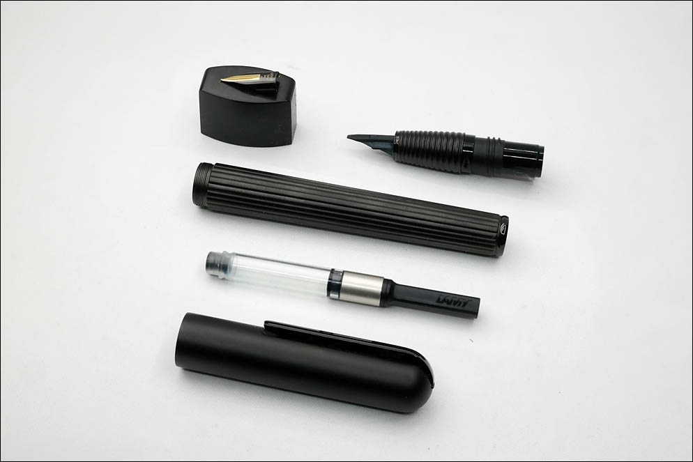 Материал корпуса — нержавеющая сталь с матовым чёрным PVD-покрытием. Клип, окончание корпуса и кольцо перед пером покрыты чёрным лаком.