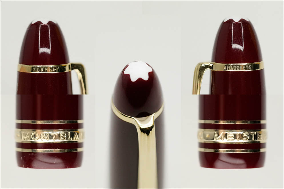 На широком кольце колпачка расположена надпись Montblanc Meisterstuck, а на кольце клипа — Germany и XM1028295 (уникальный номер модели). В навершии — фирменный логотип в виде вершины.