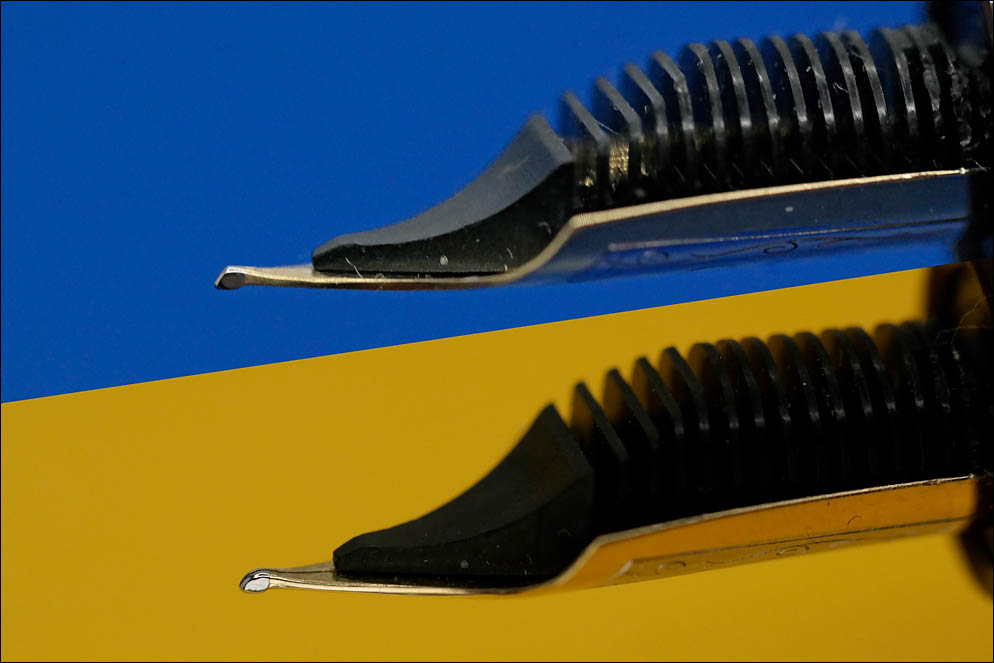 На этом снимке видна образовавшаяся площадка на кончике пера (на синем фоне). И результат после коррекции (на жёлтом).
