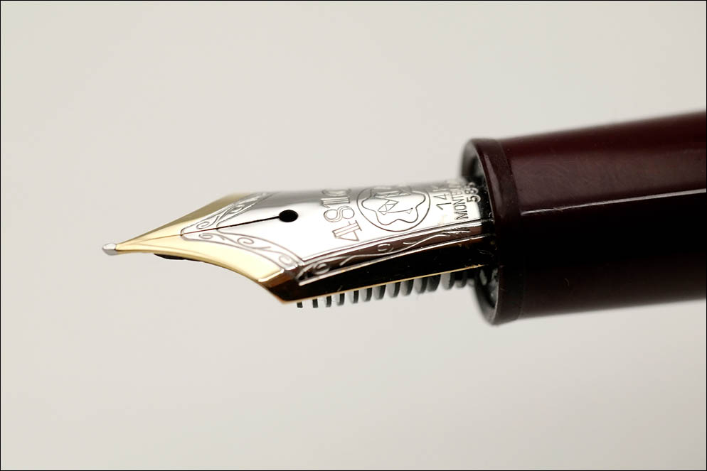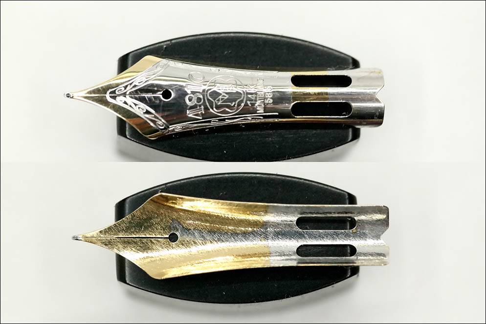 14-каратное, золотое, двухтоновое, ординарно жёсткое и, похоже, размерности EF. По периметру на перо нанесён орнамент, в середине — 4810, М в логотипе в виде вершины, 14K, Montblanc и 585. В хвостовой части присутствуют два выреза, совпадающие с выступами на фидере для правильного позиционирования.