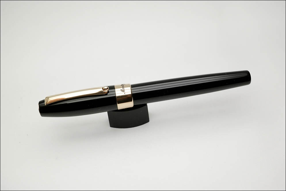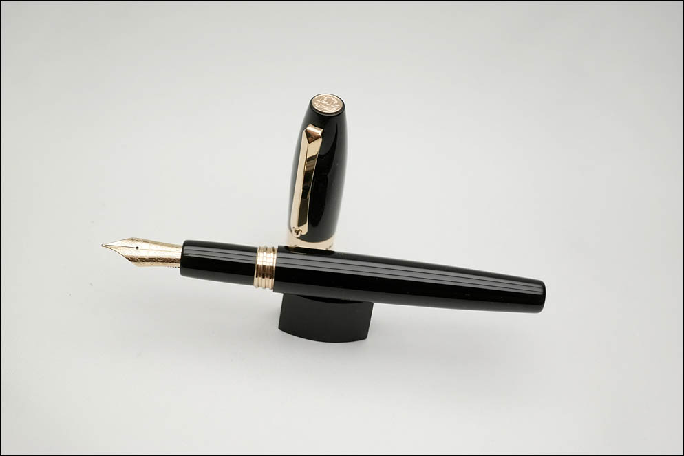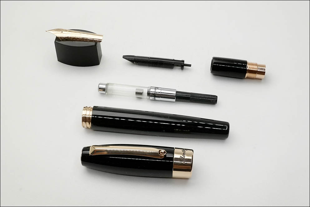 Данная ручка цилиндрической и немного бочкообразной формы с плоскими окончаниями выполнена из смолы чёрного цвета. Дизайн в сложенном виде, я бы сказал, узнаваемый и напоминает и «Мию», и «Экстру», но без колпачка схожа с Esterbrook Estie Oversized:). Система заправки картриджно-конвертерная формата интернэшнл (international), но комплектуется фирменным конвертером с резьбой в месте соединения с секцией. Колпачок традиционно на резьбе, резьба крупная с трубным профилем, закрытие/открытие за один оборот. На секции резьба металлическая, а в колпачке — пластиковая.