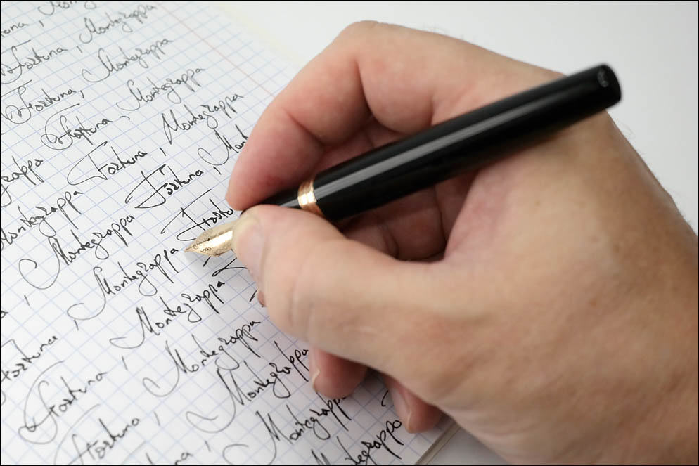 Эта ручка ко мне попала на обслуживание с просьбой разобраться в нестабильной подаче. У меня ушло 2 дня на настройку, и мне кажется, что это одна из самых проблемных ручек, что у меня была. Пропуски из-за пережатого пера я устранил практически сразу, но тут же выявились проблемы с подачей — ручка просто переставала писать через 5-7 минут непрерывного письма. Чисто технически всё выглядело если не совершенно, то вполне логично и правильно: и чистый фидер (заодно прочистил его и ультразвуком, и механически), и ровный, сужающийся пропил между половинками (отполировал дополнительно), и отсутствие бэби боттома (исправил), и отполированное перо, и исправный конвертер, к тому же, на резьбе. Я даже менял чернила (владелец пользуется Pelikan 4001 Brilliant Black), чтобы проверить на несовместимость с данным фидером, и пробовал картриджи, но она просто останавливалась, и всё — что на чернилах Pelikan 4001 Black, что на Montblanc Royal Blue, что на родных Montegrappa Black.