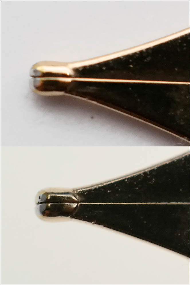 Вот так выглядело оригинальное перо. Не знаю, насколько хорошо видно небольшой бэби боттом с расходящейся щелью на кончике, при том что сами половинки достаточно плотно сведены.
