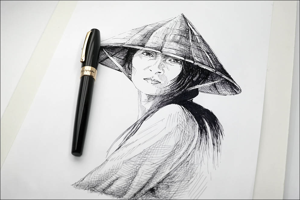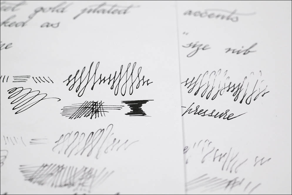 Ещё один интересный и непонятный момент с данной ручкой — это размерность пера, указанная на пере как B, при этом величина твёрдосплавной напайки явно говорит о меньшем размере. Более того, позолота покрывала полностью кончик, что говорит о его заводской первозданности, никто до меня не работал над этим пером и не перетачивал его, а этикетка на коробке явно говорит о размерности F, что подтвердилось предварительным тестом. После обслуживания ширина линии прямой стороной составляет 0,35 мм, нажим позволяет увеличить линию за счёт более обильной подачи до 0,7 мм, но не рекомендую часто пользоваться этой возможностью, ибо сталь достаточно мягкая и неупругая, так что со временем щель между половинками может увеличиться и подача превратится в обильную. Обратная сторона даёт очень сухую и почти прозрачную линию около 0,25 мм, при этом нестабильную.