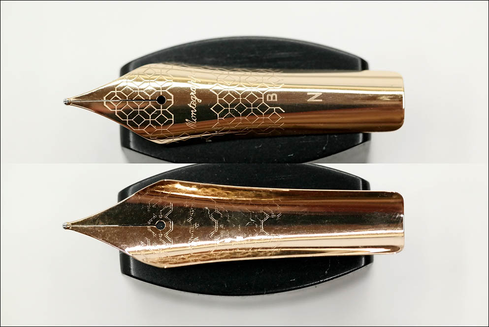 Перо крупное, 6-го размера, стальное, покрытое розовым золотом, установлено с фидером на трении в пластиковом стакане, который по всей видимости вклеен, поскольку ключей для снятия нет. В отличии от упомянутых ранее старших моделей Miya и Extra 1930, это модель обладает, увы, пластиковым фидером, точно таким же, как в ранее показанном Reminiscence Oversize. На перо нанесён современный узор «Монтеграппы», состоящий из 8-гранников и квадратов, но мне напоминающий соты, имя бренда Montegrappa курсивом и размерность пера В (что вызывает дополнительные вопросы). В скрытой хвостовой части пера имеется нанесённый лазерным гравёром символ N, не знаю, что он значит.