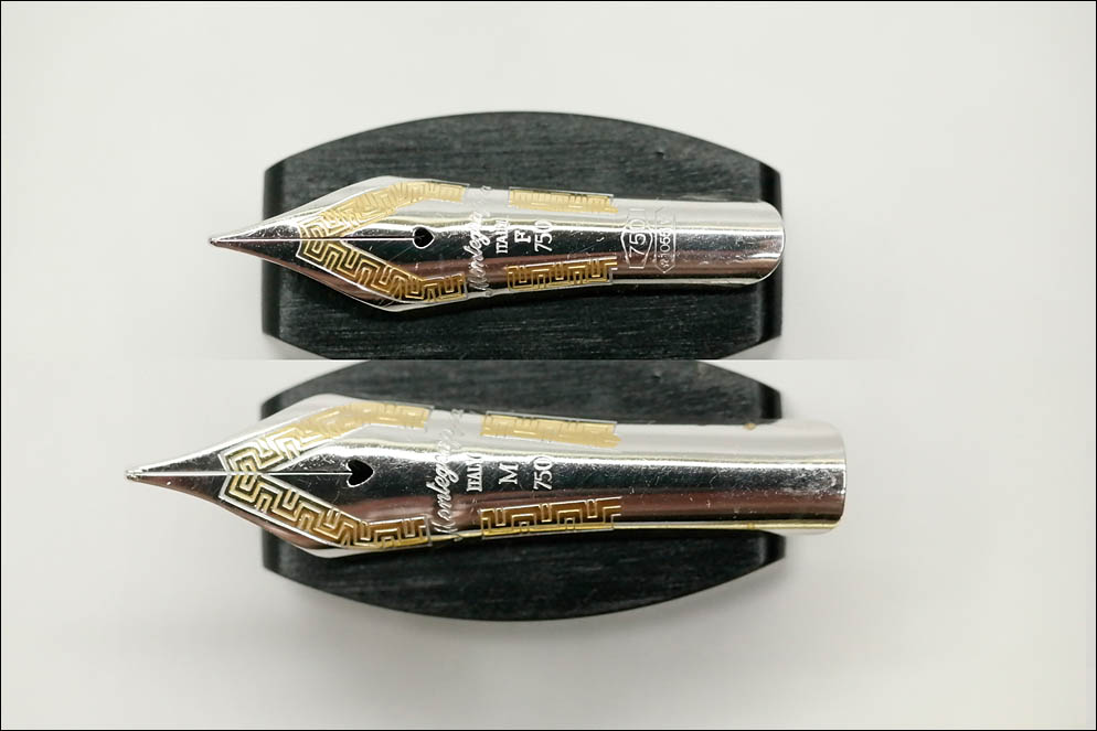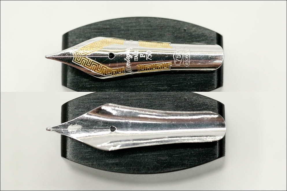 По периметру на него нанесён греческий узор жёлтого цвета. Под воздушным отверстием расположено название бренда Montegrappa, страна ITALY, размерность F и чистота золота 750. В нижней части, которая не видна при установленном пере, — государственное клеймо золота 750-й пробы и ювелирное клеймо дома Montegrappa ✩1055VI.