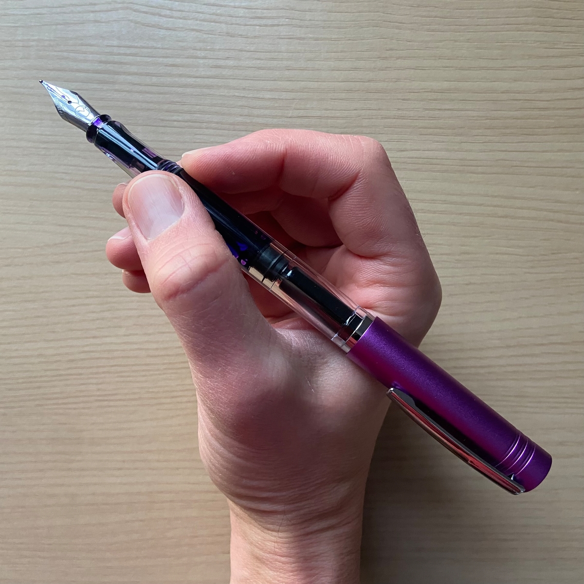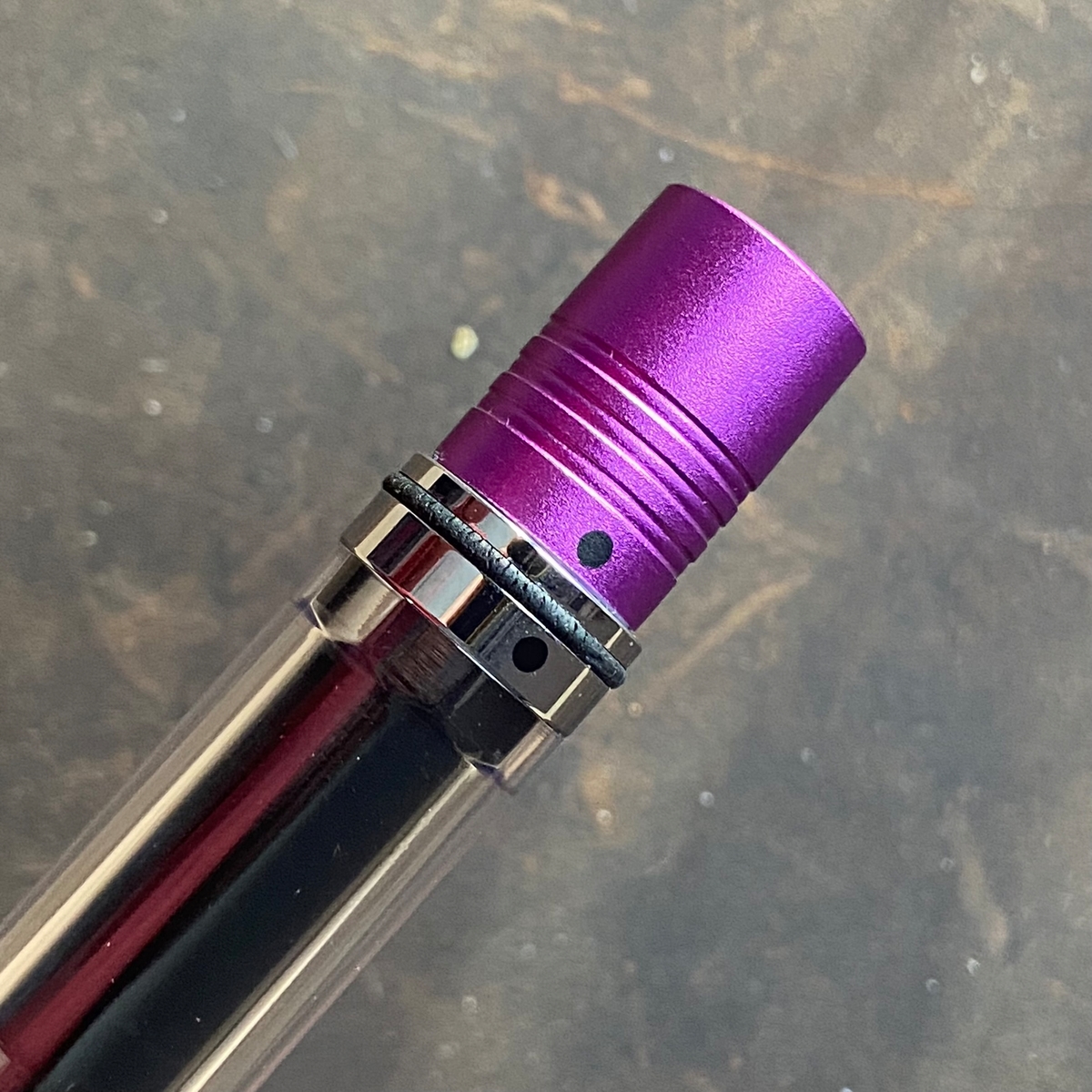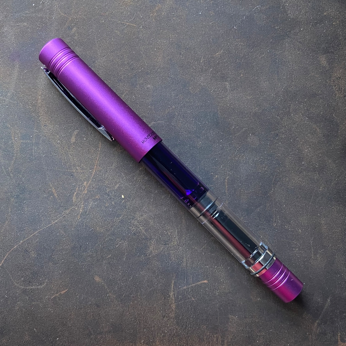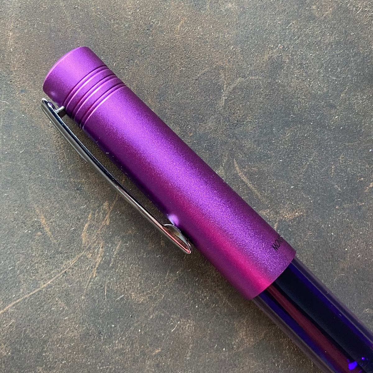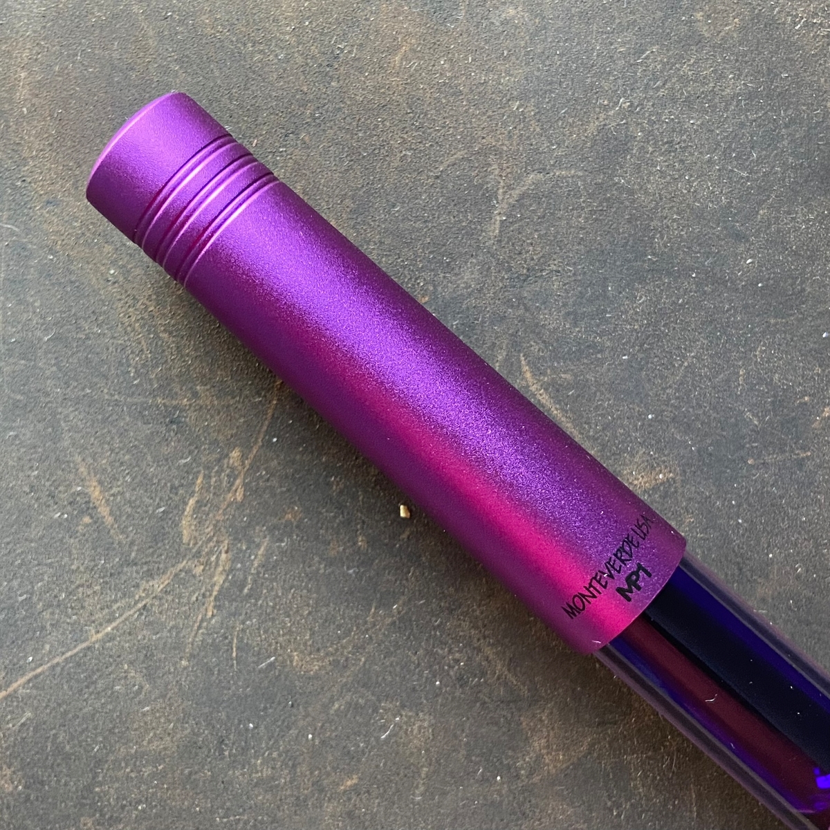 По моему мнению, Monteverde MP1 выглядит эффектно: красивый фиолетовый металлик колпачка и рукоятки системы заправки, выполненных из анодированного алюминия; кристально прозрачный акрил корпуса, демонстрирующий залитые внутрь чернила; стальная фурнитура.