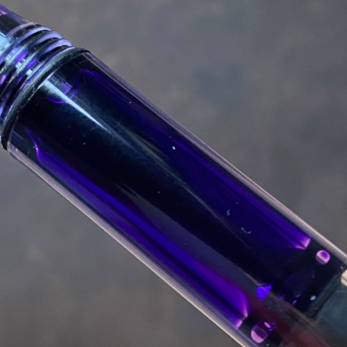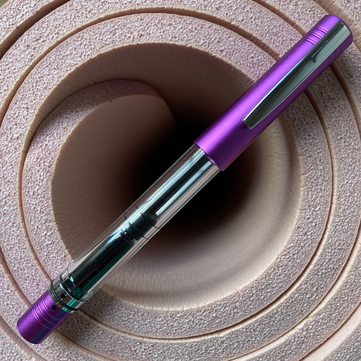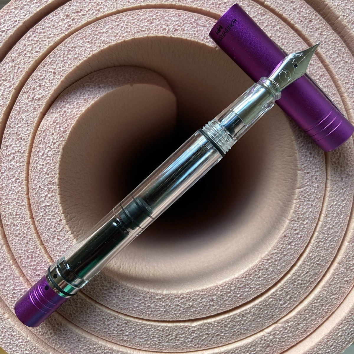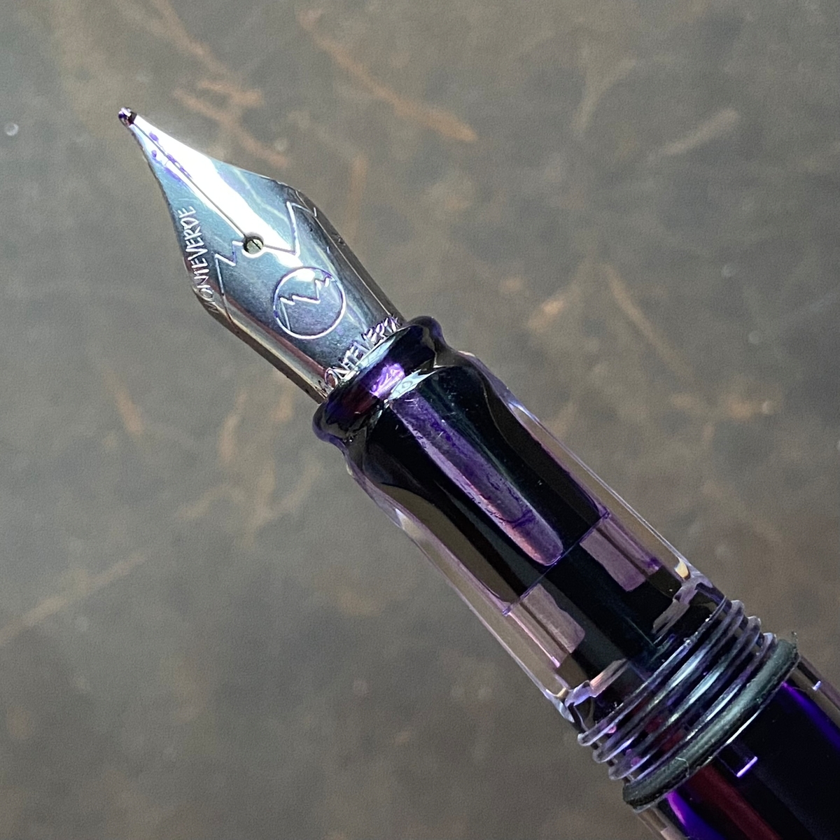 По моему мнению, Monteverde MP1 выглядит эффектно: красивый фиолетовый металлик колпачка и рукоятки системы заправки, выполненных из анодированного алюминия; кристально прозрачный акрил корпуса, демонстрирующий залитые внутрь чернила; стальная фурнитура.