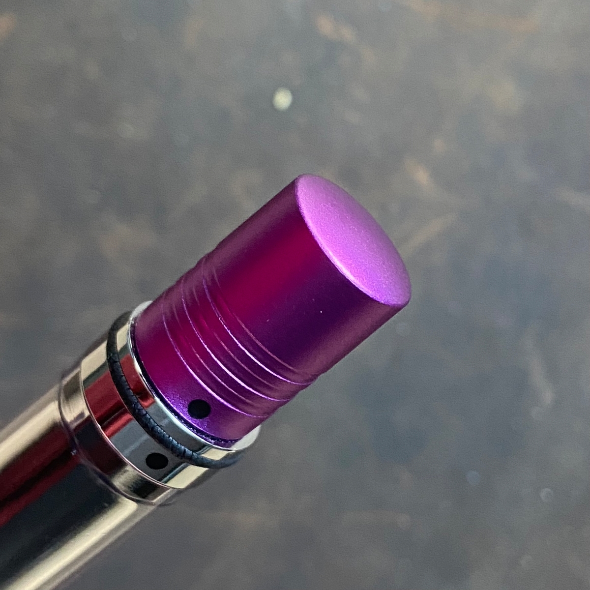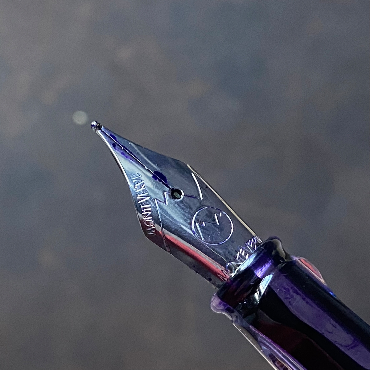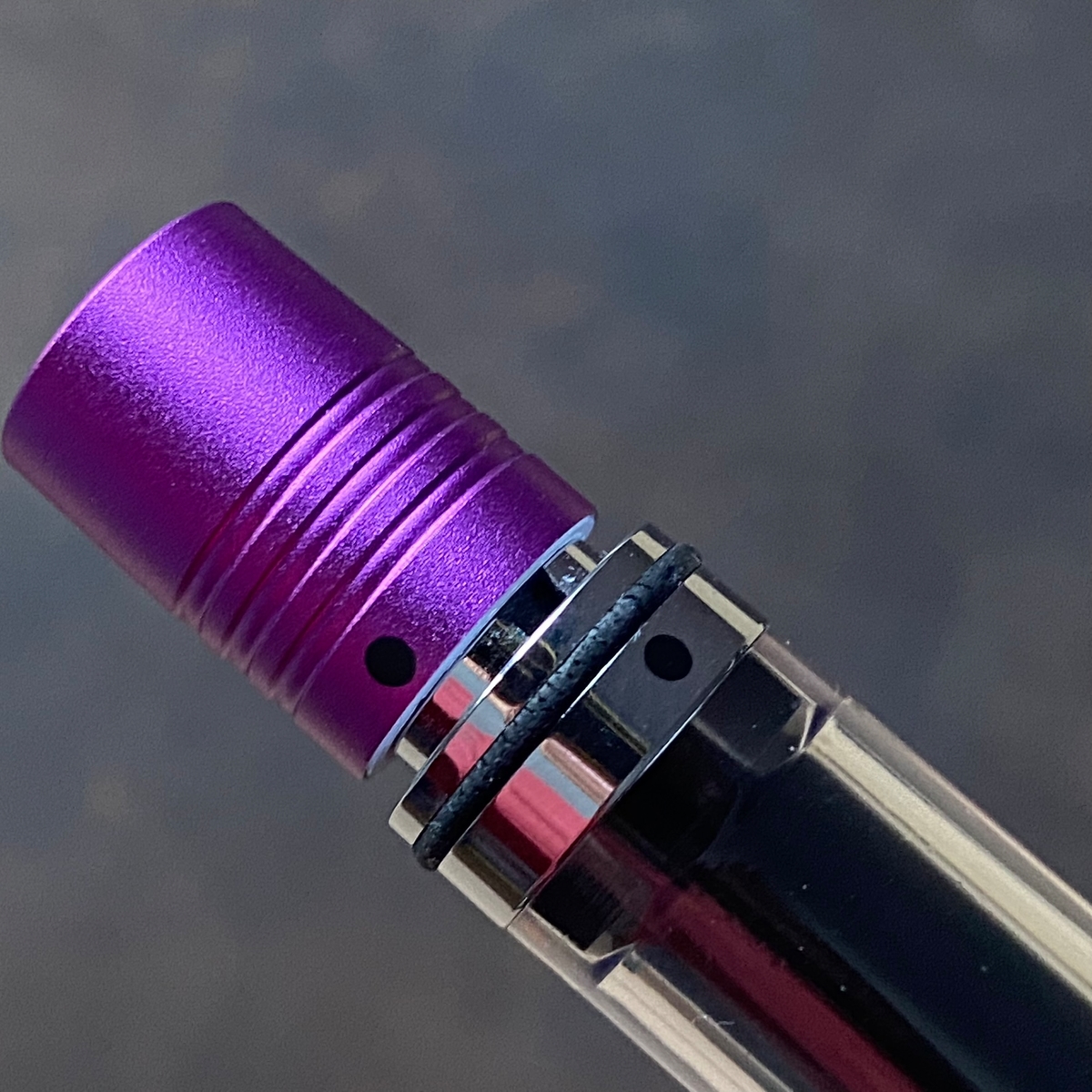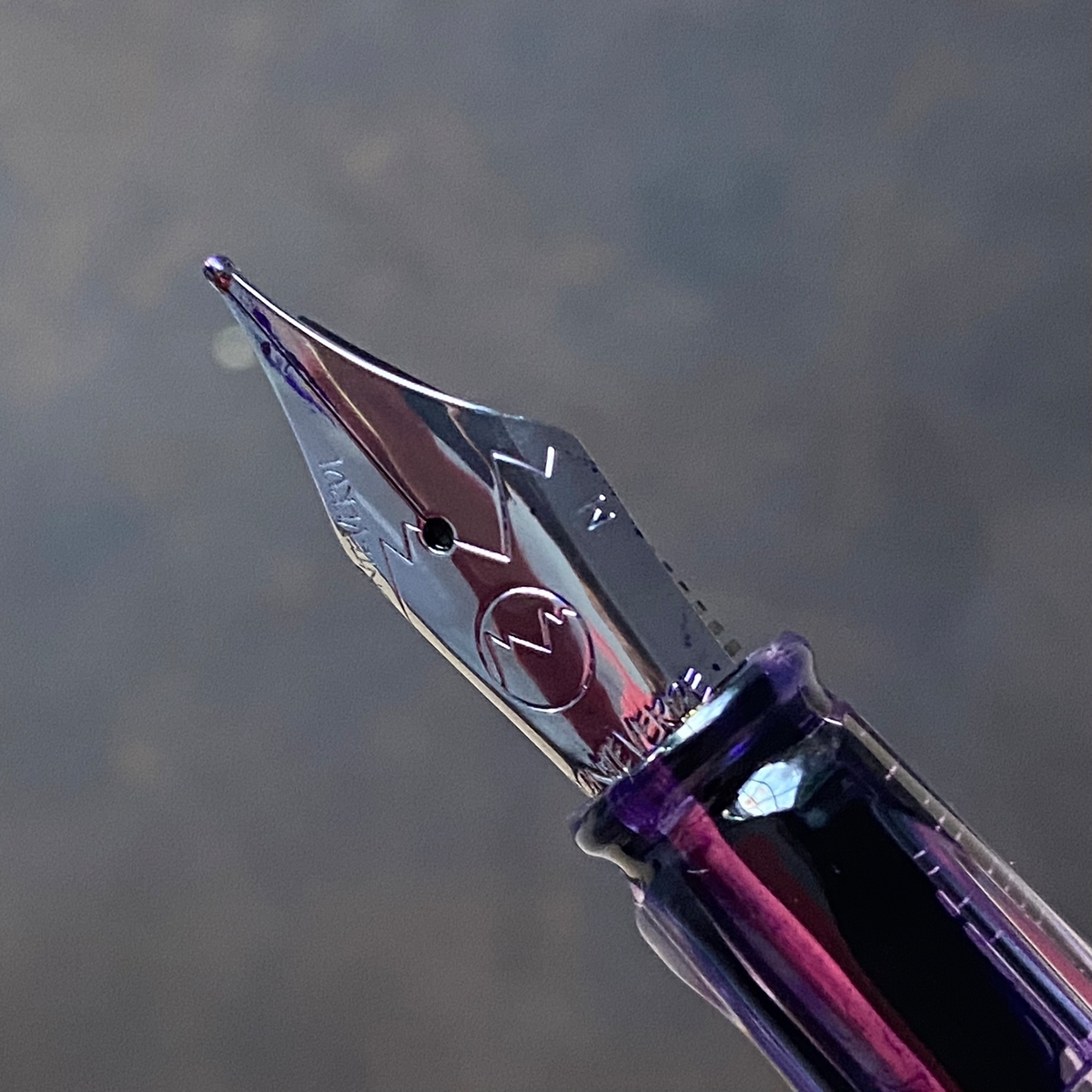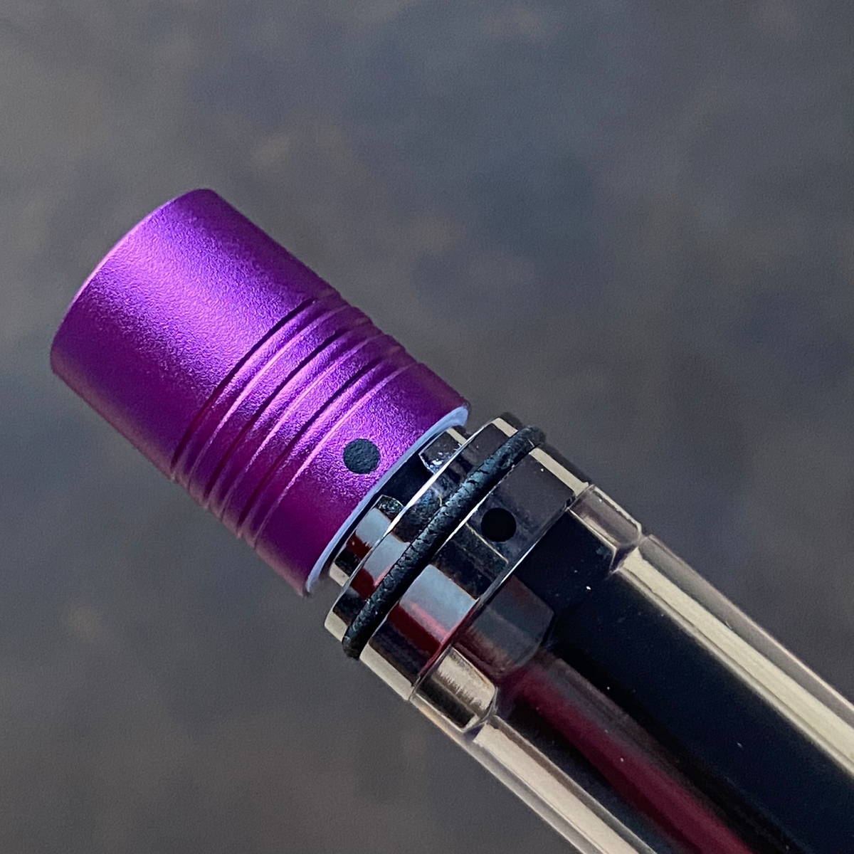 По моему мнению, Monteverde MP1 выглядит эффектно: красивый фиолетовый металлик колпачка и рукоятки системы заправки, выполненных из анодированного алюминия; кристально прозрачный акрил корпуса, демонстрирующий залитые внутрь чернила; стальная фурнитура.
