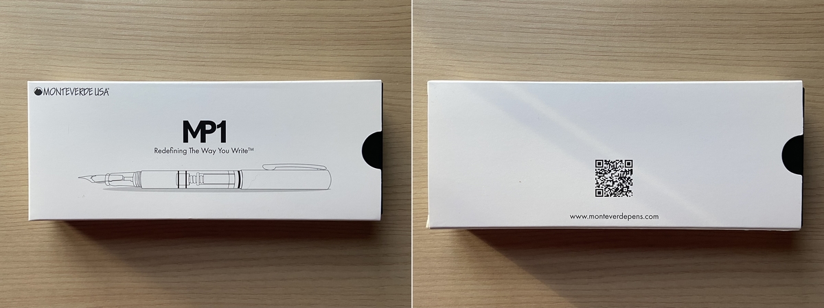 Сначала взору предстаёт обечайка из тонкого картона, на лицевой стороне которой логотип и название компании, имя модели, слоган «Переосмысление способа письма» и схематическое изображение ручки с надетым на торец колпачком. На обратной же — QR-код, ведущий на yafabrands.com, и адрес сайта Monteverde.
