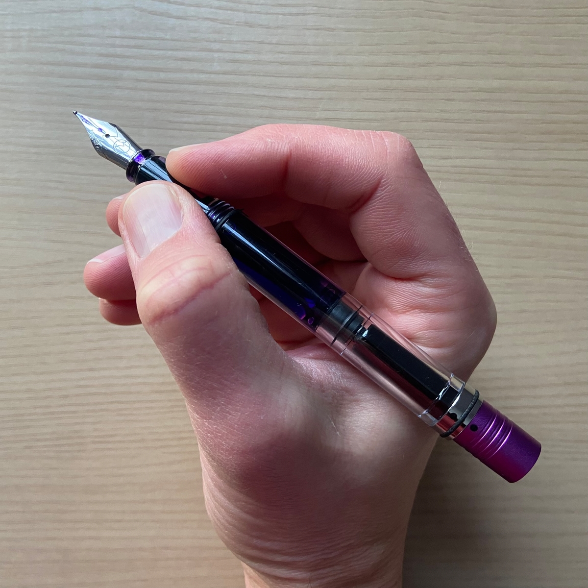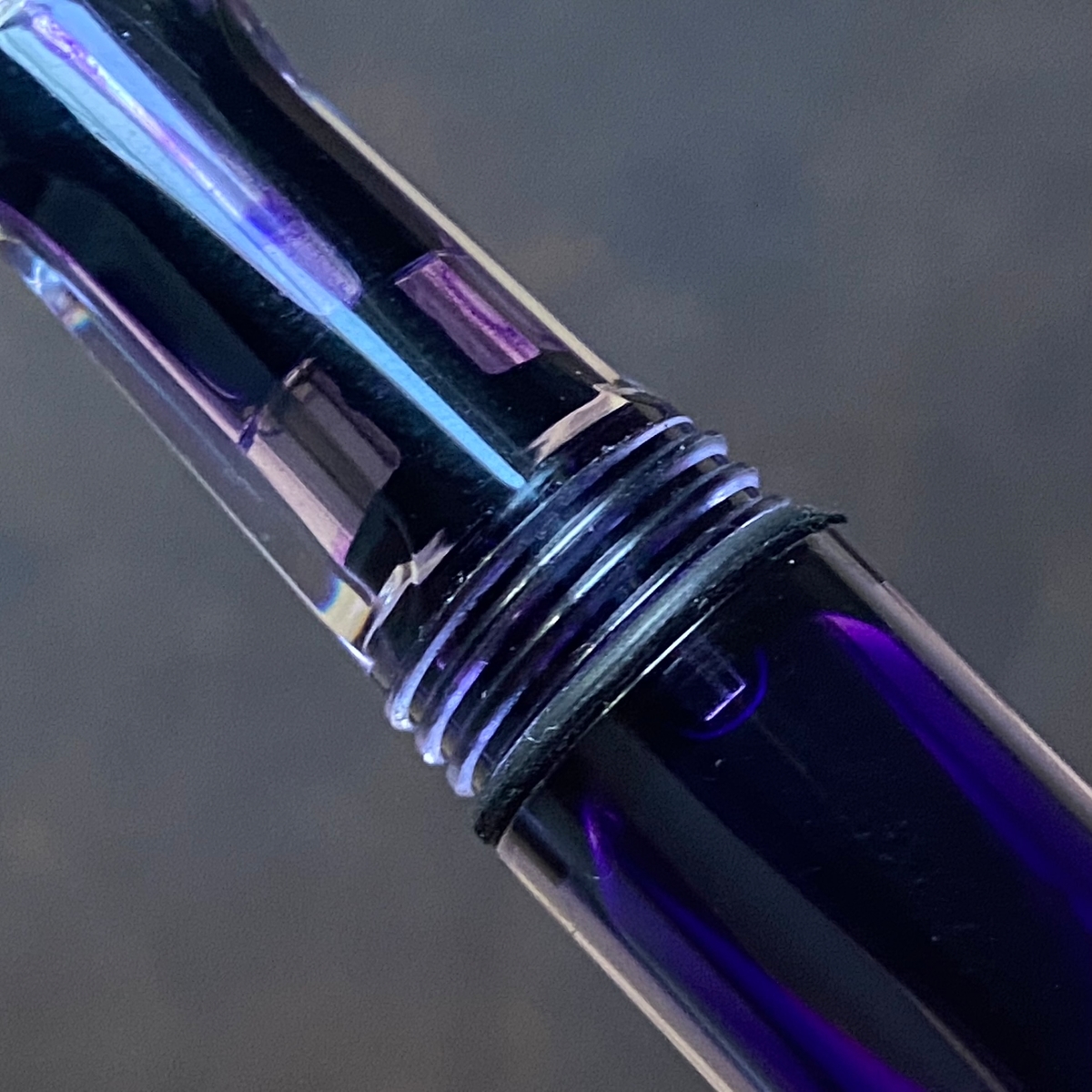 Чтобы открутить колпачок, требуется три оборота. Под ним — прозрачная секция с треугольным грипом (подобный у перьевых ручек Lamy Safari, Al-Star, Lx, TWSBI ECO-T).