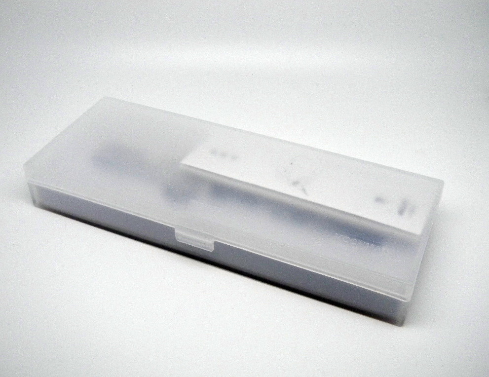 Довольно невзрачная пластиковая коробочка с пенной вставкой и универсальной для всего выпускаемого модельного ряда мини-этикеткой.
